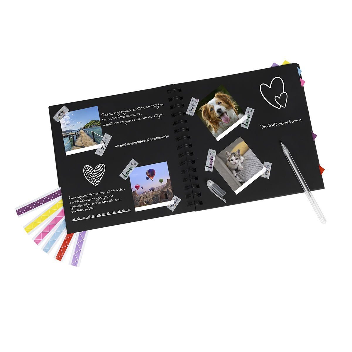 Anı Defteri, yaşadığınız güzel anıları, düşünceleri veya duygusal anları kaydetmek için harika bir yoldur. Bu defter, 2 adet renkli sticker, 2 adet desenli bant ve 1 adet simli jel kalem ile birlikte gelir. Bu ekstra özelliklerle defterinizi kişiselleştirebilir ve anılarınızı daha özel hale getirebilirsiniz.
