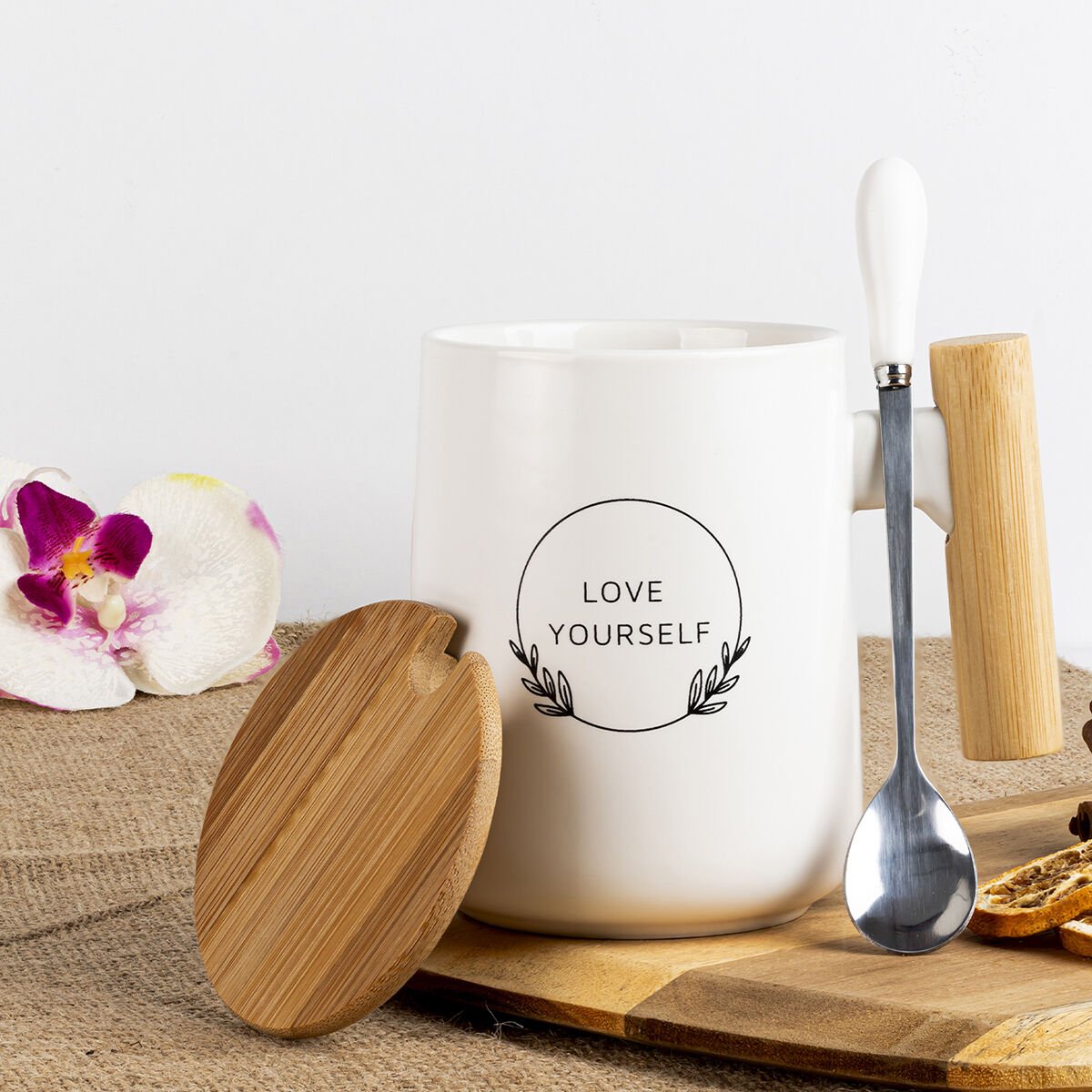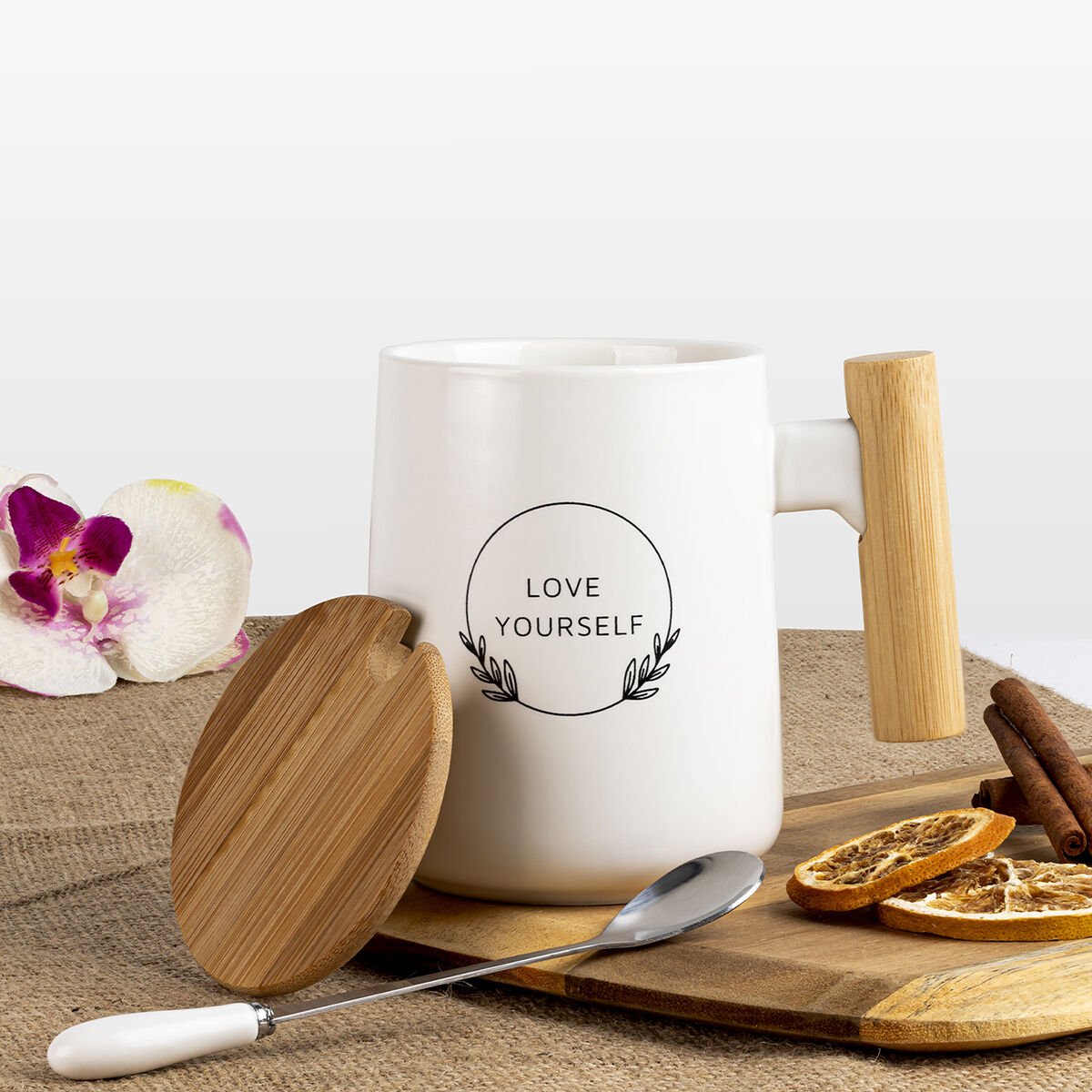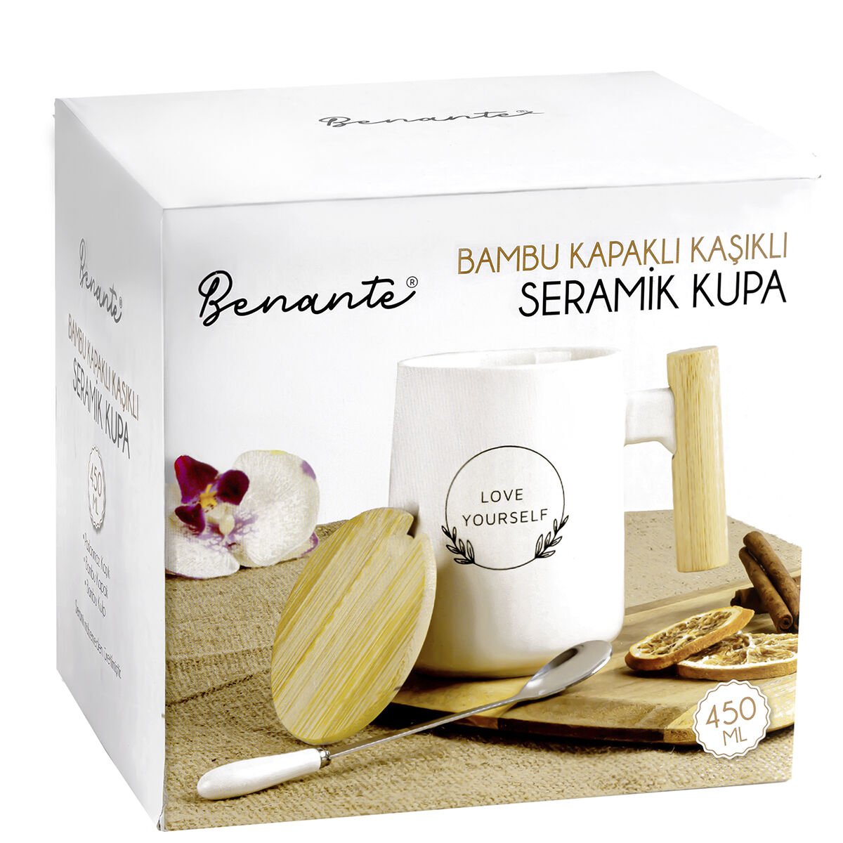 Doğal ve Şık Sunumlar İçin: Bambu Kapaklı Kaşıklı Seramik Kupa 450 ml