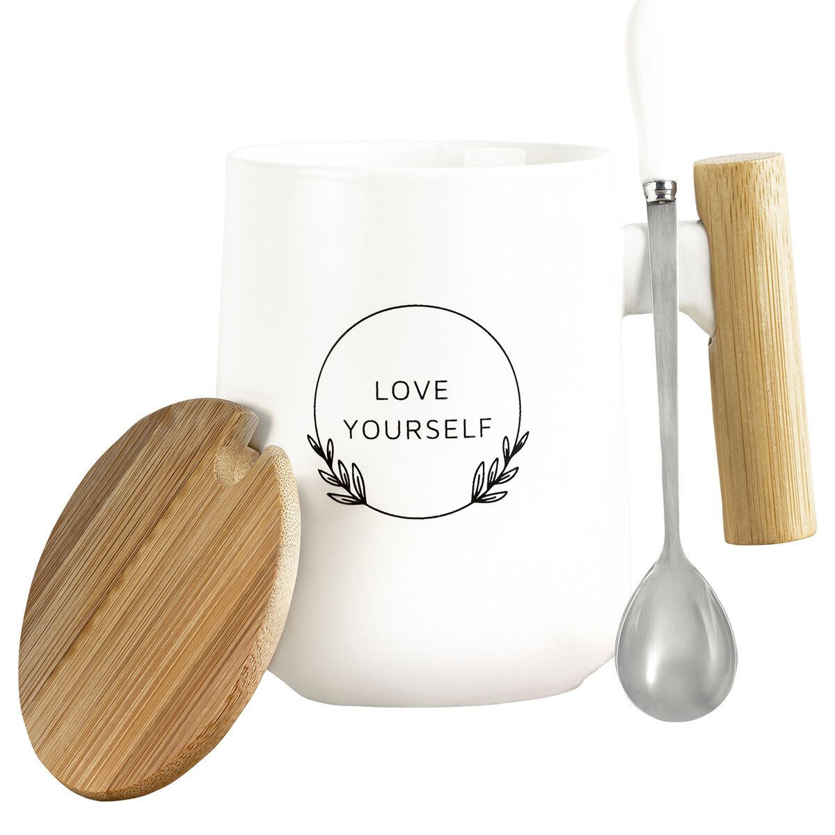 - Materyal: Seramik kupa, paslanmaz çelik kaşık, bambu kapak ve kulp