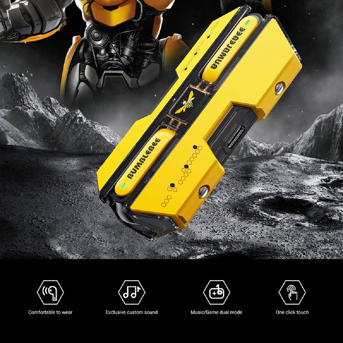 Transformers evreninden ilham alan Bumblebee Bluetooth Kulaklık, etkileyici tasarımı ve teknolojik özellikleriyle her anınıza enerji katıyor. Müzik ve oyun modlarıyla sesin sınırlarını zorlamaya hazır olun!