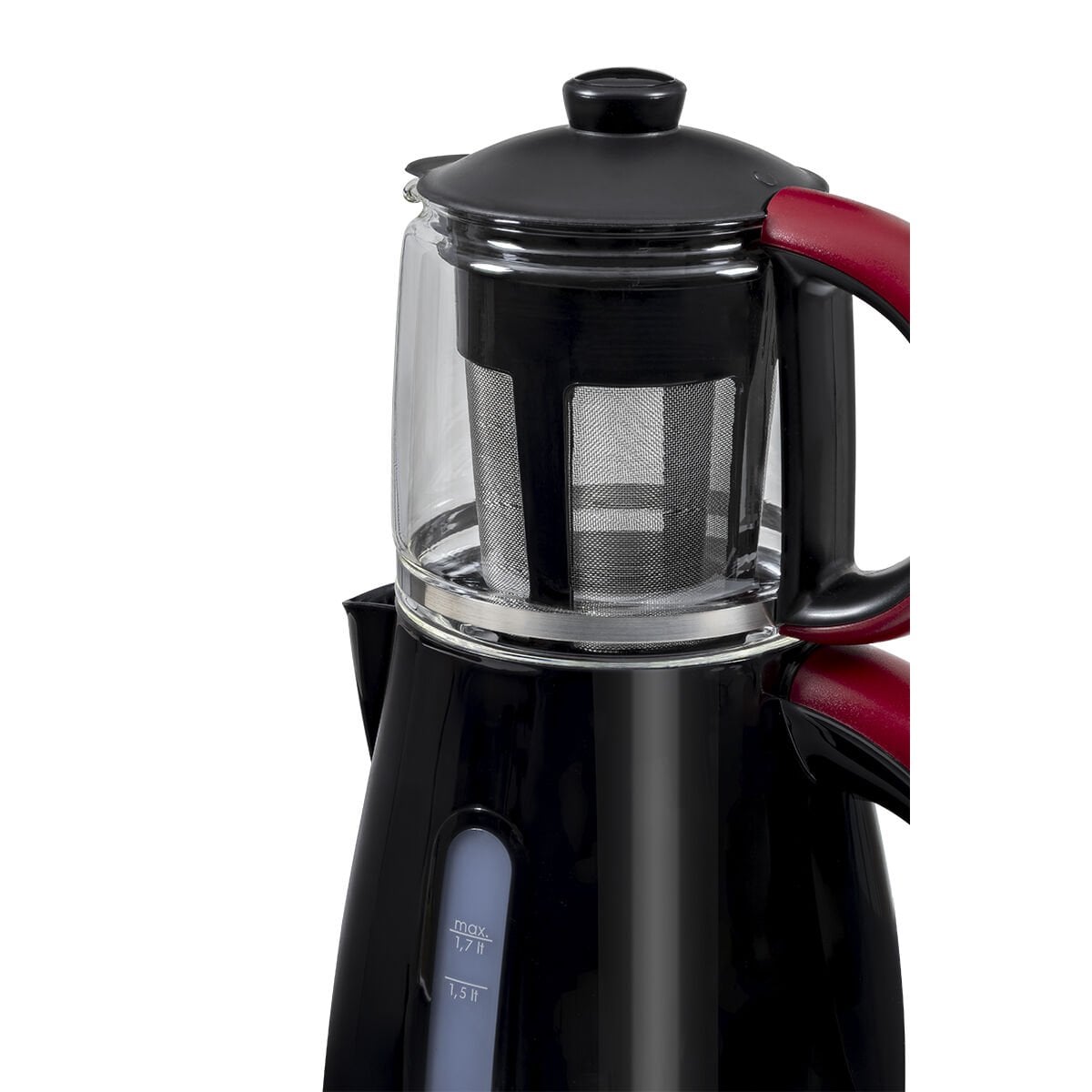 1.7 litrelik geniş su haznesi sayesinde kalabalık misafirlere bile kolayca servis yapabilir, 0.85 L cam demlik ve paslanmaz çelik süzgeç ile çayın özünü kaybetmeden demleyebilirsiniz.
