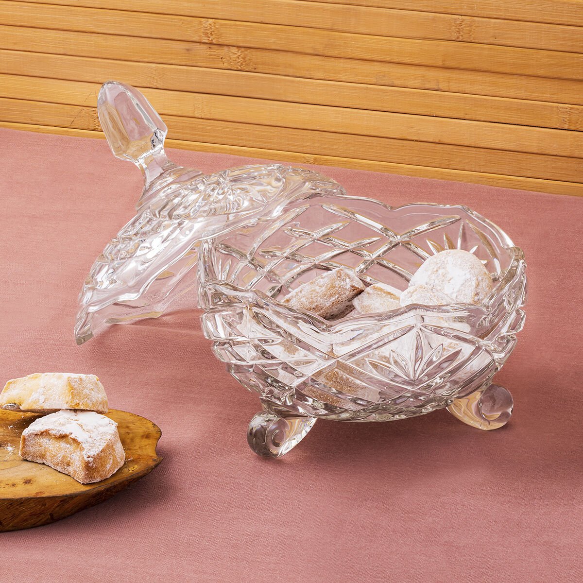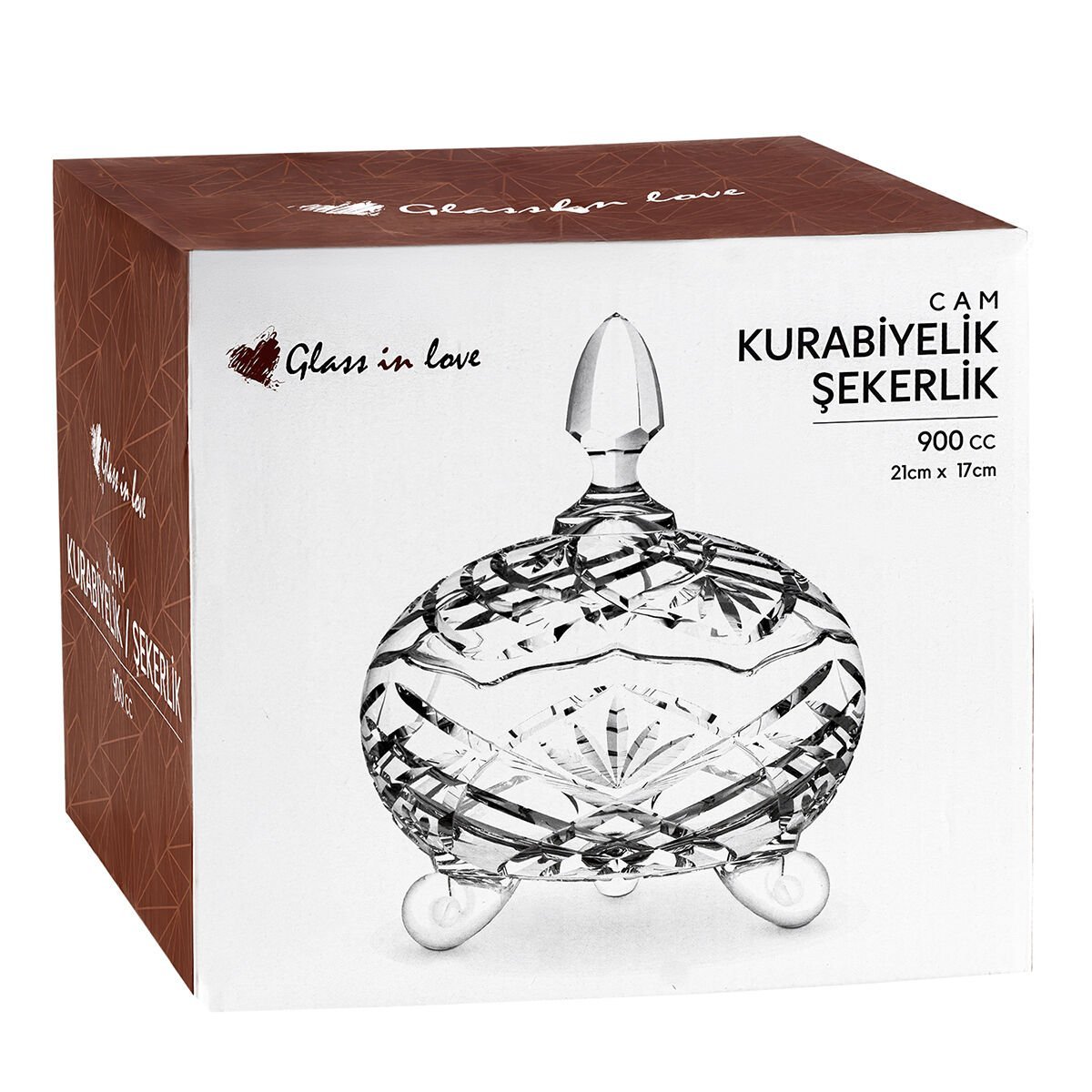 Parlak ve kristal şeffaflığındaki bu cam kurabiyelik, 900 cc hacmi ve 21 × 17 cm ölçüleriyle kurabiye, şeker, lokum, çikolata veya küçük atıştırmalıkları hijyenik ve şık bir şekilde sunmanızı sağlar.
