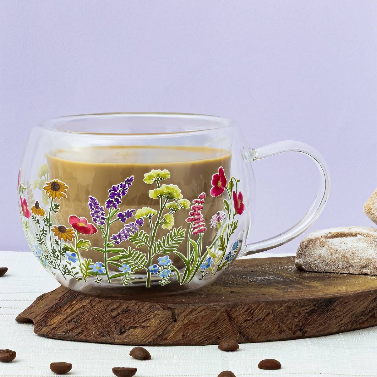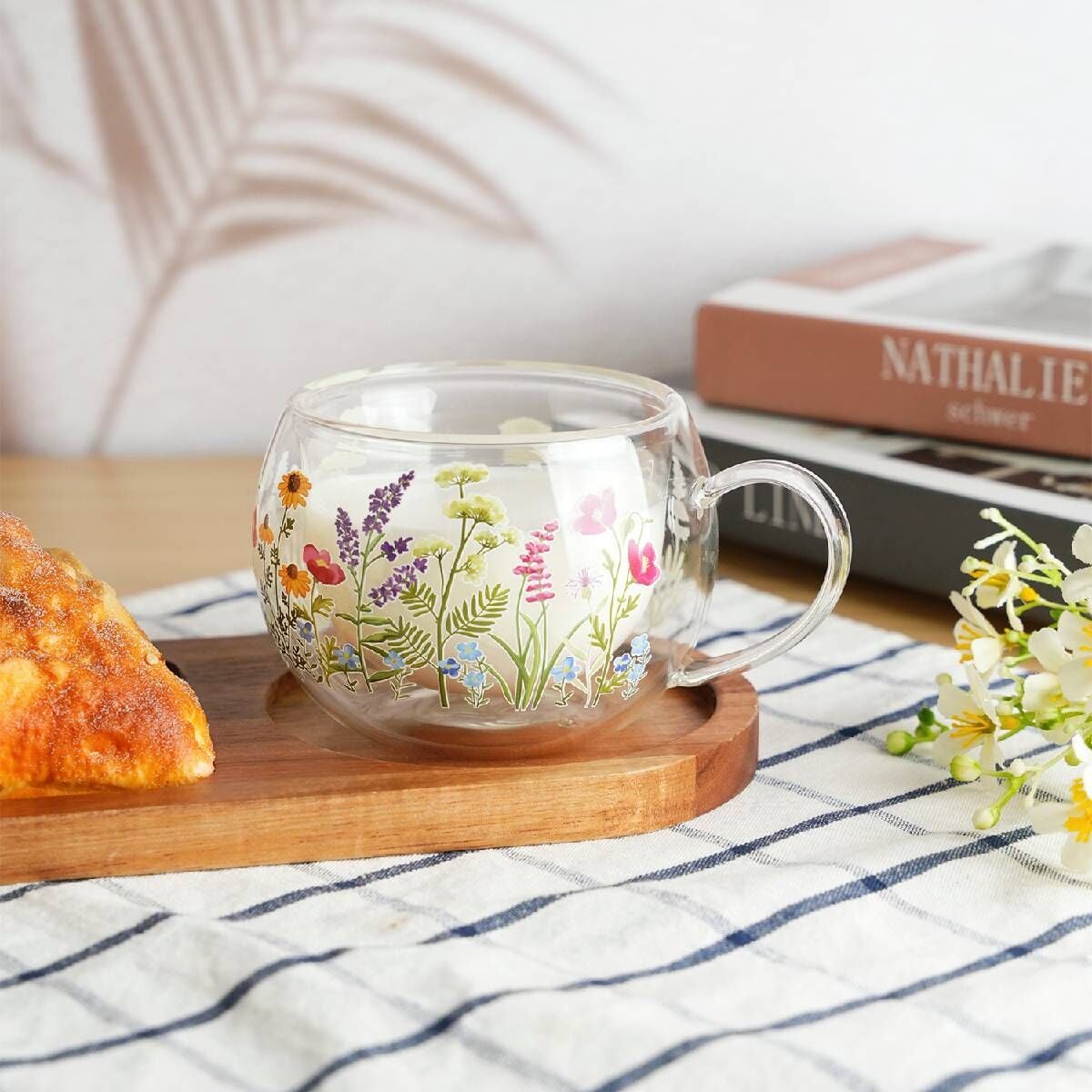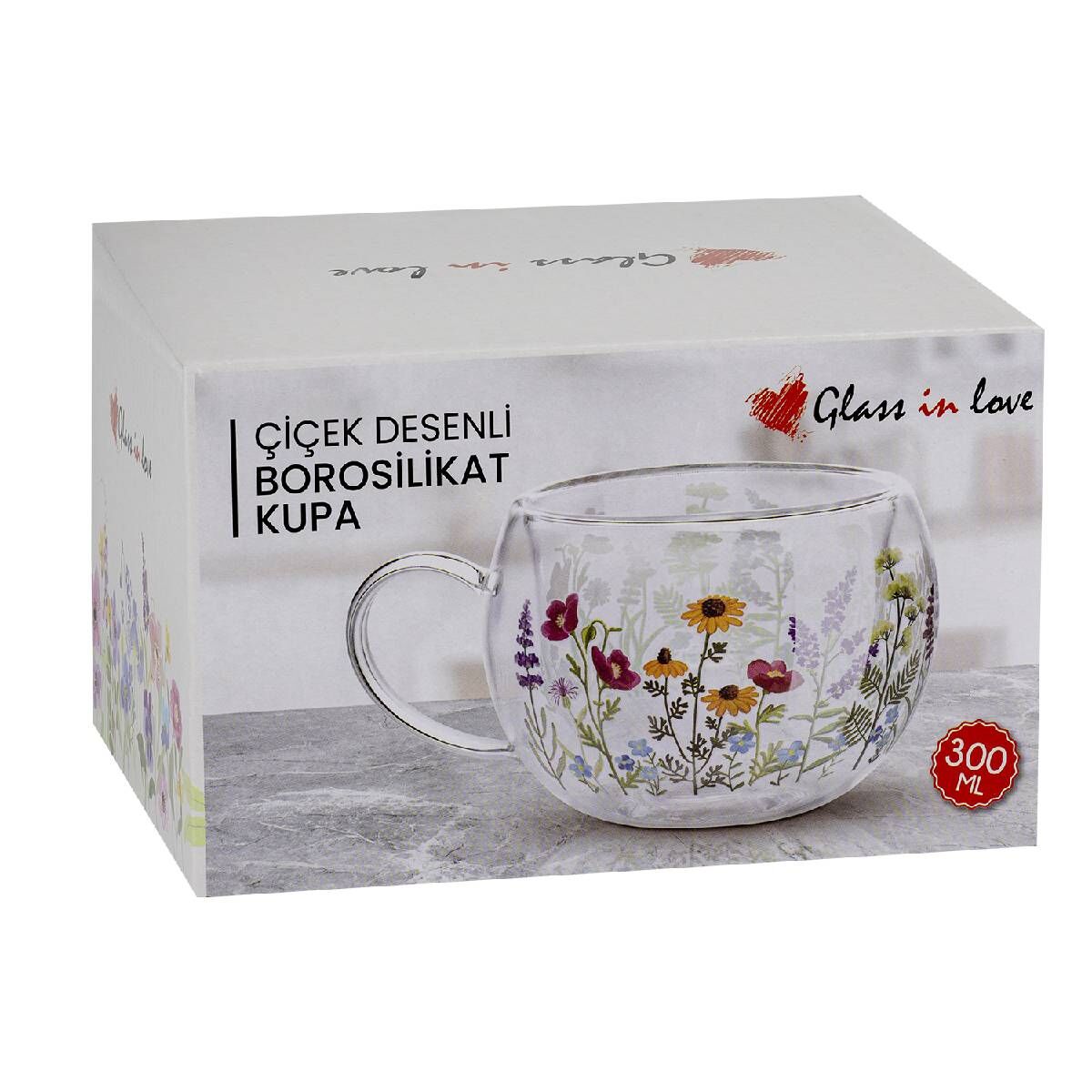 Çiçek desenli borosilikat cam kupa, modern zarafeti ve üstün cam kalitesiyle çay ve kahve keyfinize şıklık katıyor. Hafif ama dayanıklı yapısıyla günlük kullanıma uygundur.