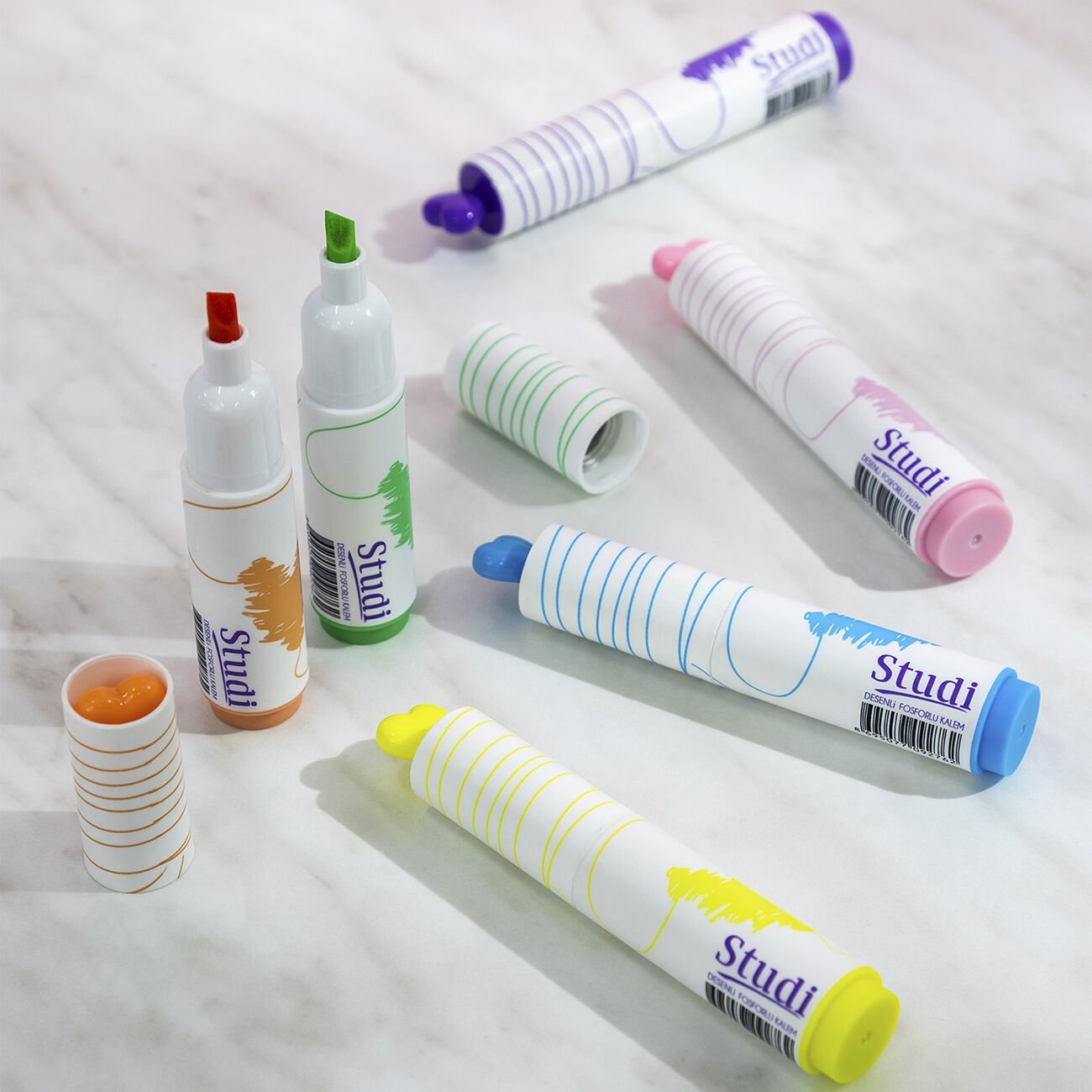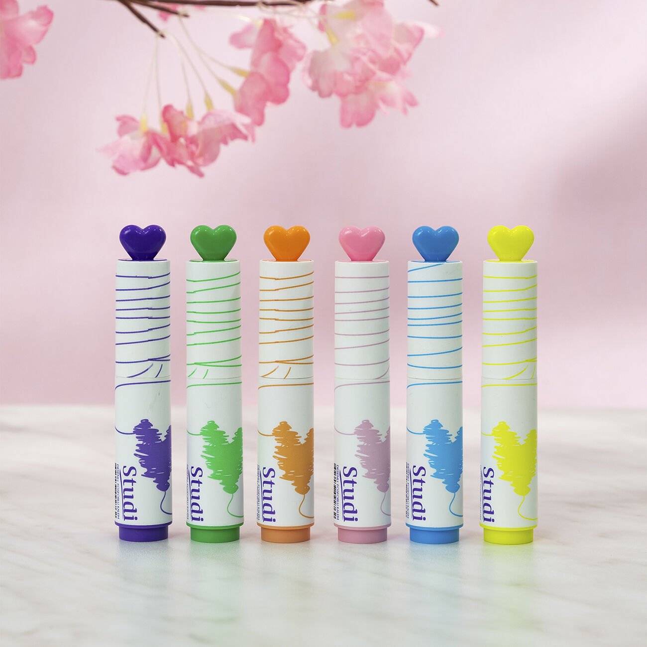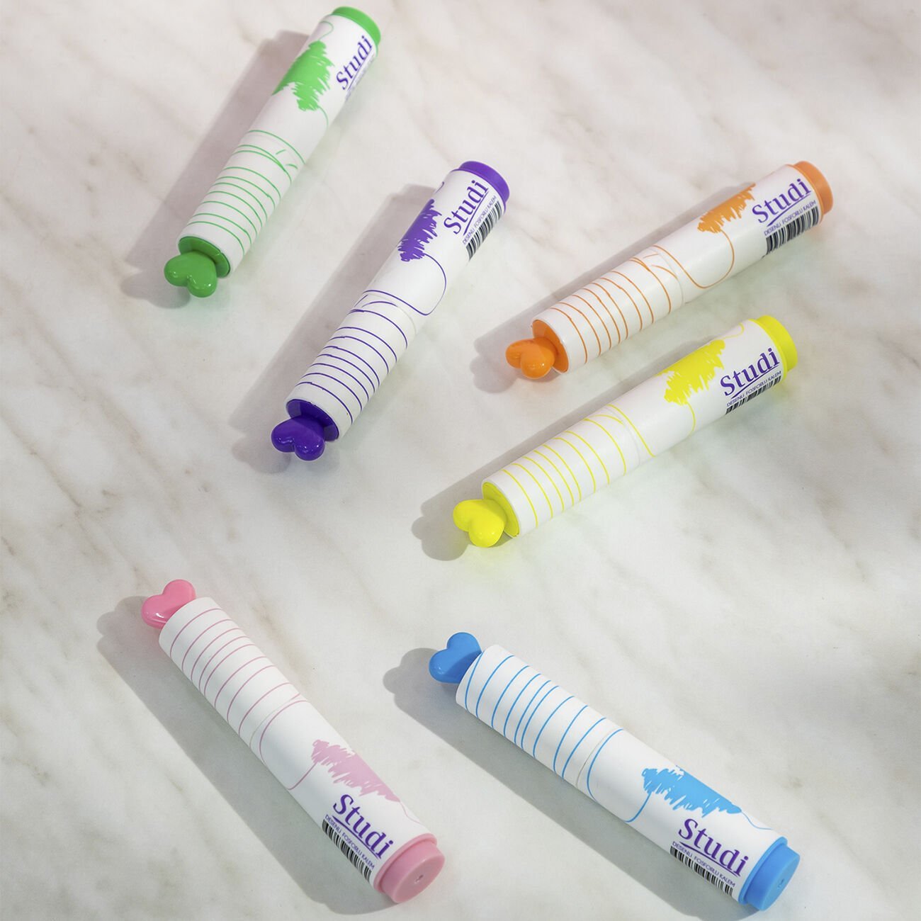 Studi’nin eğlenceli ve şık tasarıma sahip Desenli Kalp Figürlü Fosforlu Kalem Seti - 6'lı, hem yazılarınıza renk katmak hem de notlarınıza estetik bir dokunuş yapmak için tasarlandı.