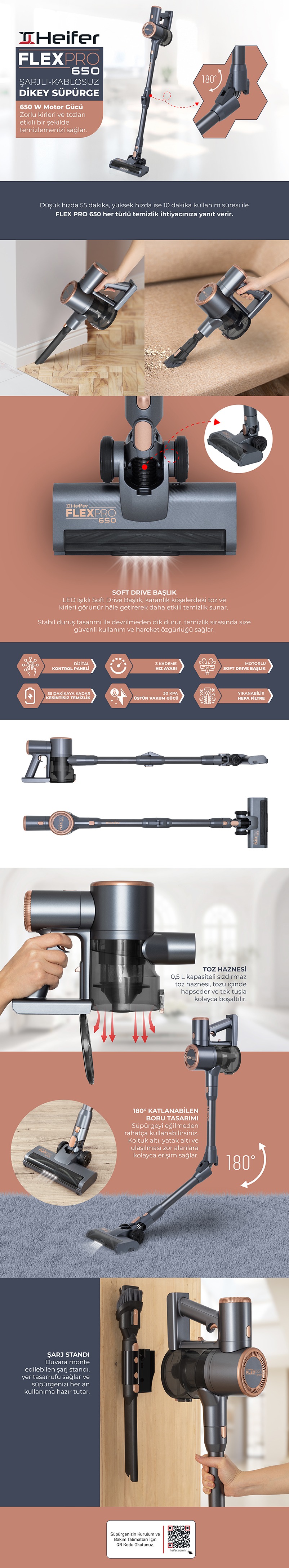 Heifer FlexPro 650 Watt Şarjlı Kablosuz Katlanabilir Dikey Süpürge, güçlü motor performansı, gelişmiş filtreleme teknolojisi ve ergonomik tasarımı ile ev temizliğini daha pratik, hızlı ve etkili hale getirmek için geliştirilmiş modern bir kablosuz süpürgedir. Günlük temizlik ihtiyaçlarını karşılamak için tasarlanan bu model, güçlü emiş gücü sayesinde halı, parke, fayans ve ulaşılması zor alanlarda derinlemesine temizlik sağlar.