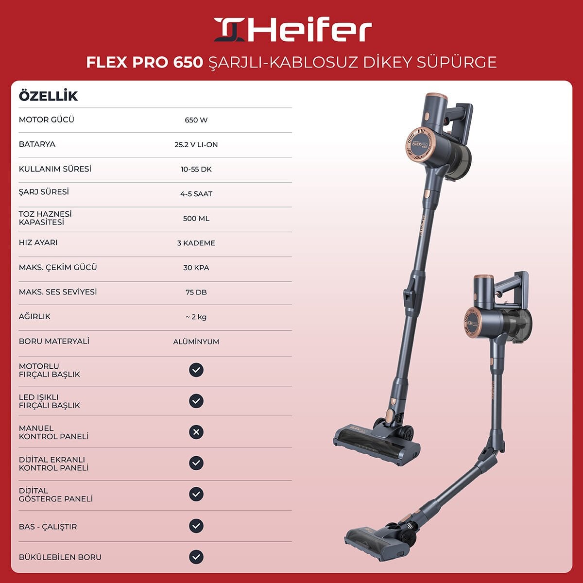 Heifer FlexPro 650 Watt Şarjlı Kablosuz Katlanabilir Dikey Süpürge