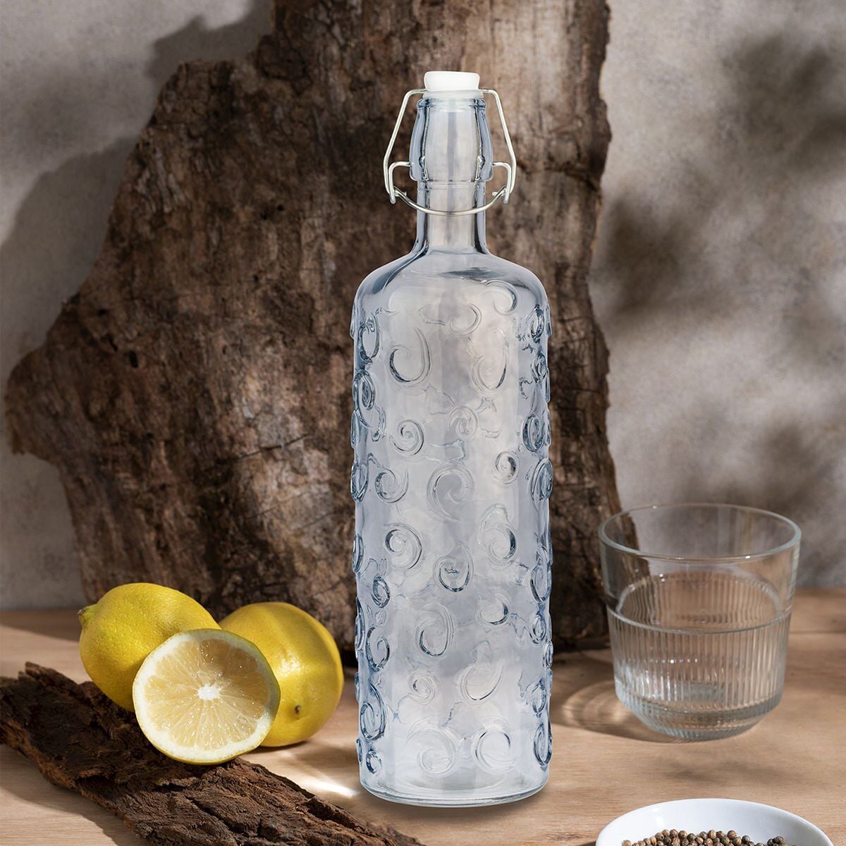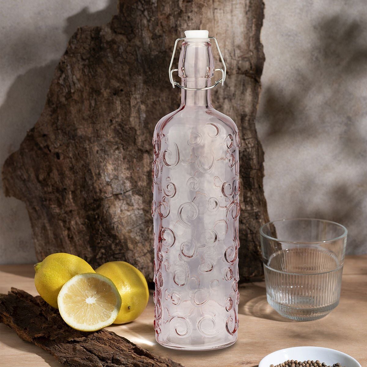 Şık ve renkli cam tasarımıyla bu su şişesi, masanızda veya mutfak tezgahınızda güzel bir dekoratif öğe olarak dikkat çeker.