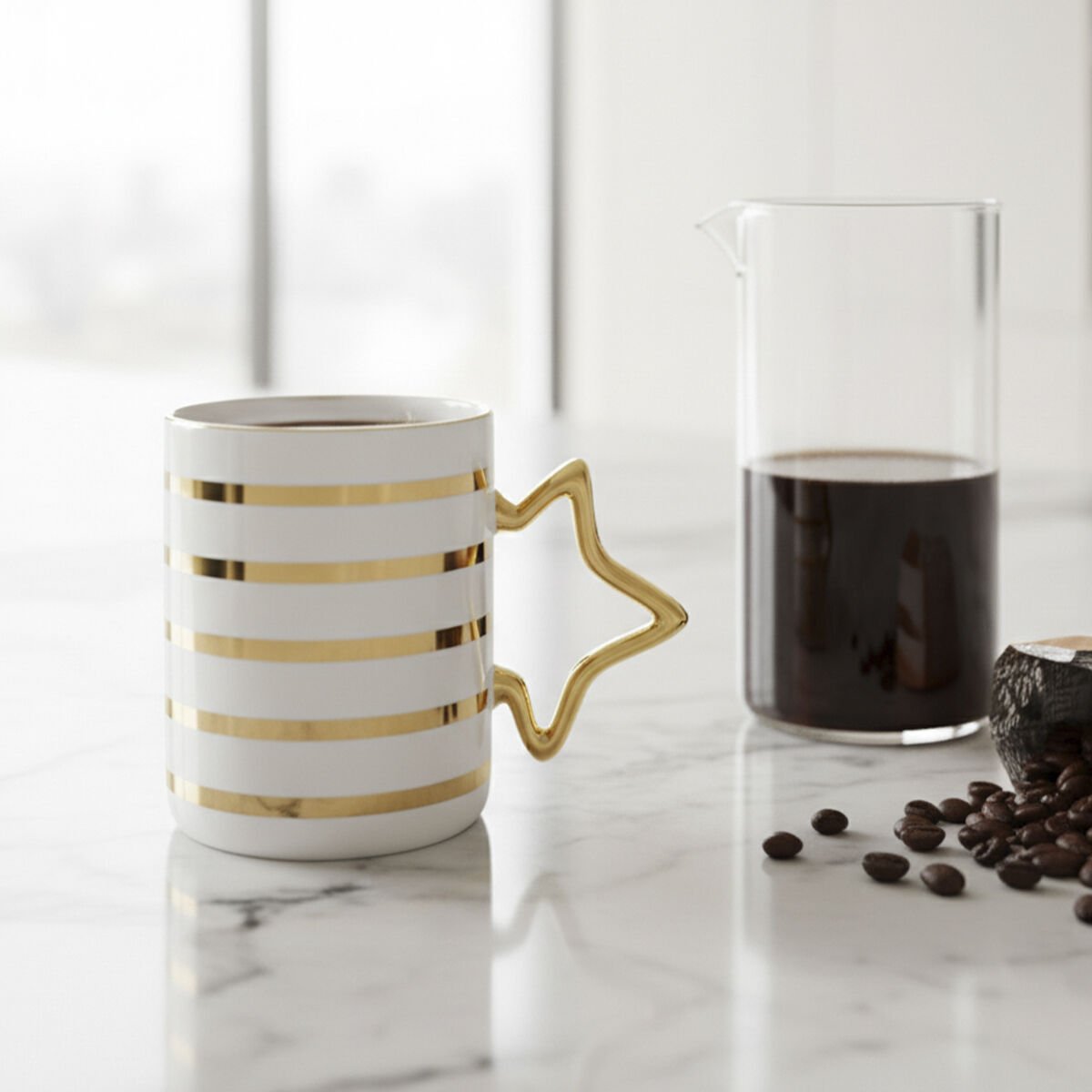 - Şık tasarım: Altın yıldız desenleri, kupaya modern ve göz alıcı bir görünüm kazandırarak mutfak dekorunuza şık bir dokunuş ekler.