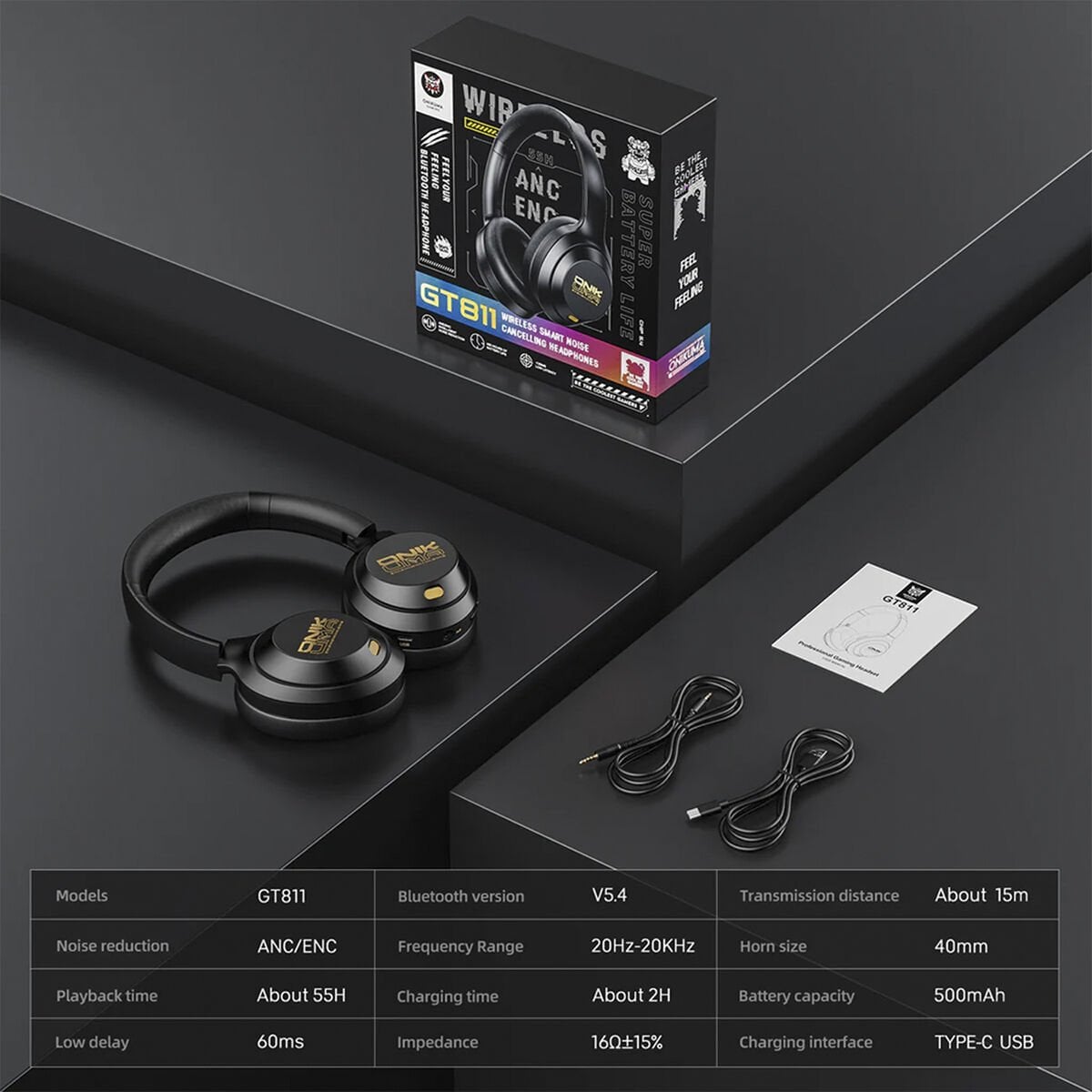 - Kablosuz Bluetooth Oyuncu Kulaklığı - GT811, Bluetooth 5.4, 55 saate varan pil ömrü ve ANC gürültü engelleme özelliğiyle oyun ve müzikte üstün deneyim sunar.