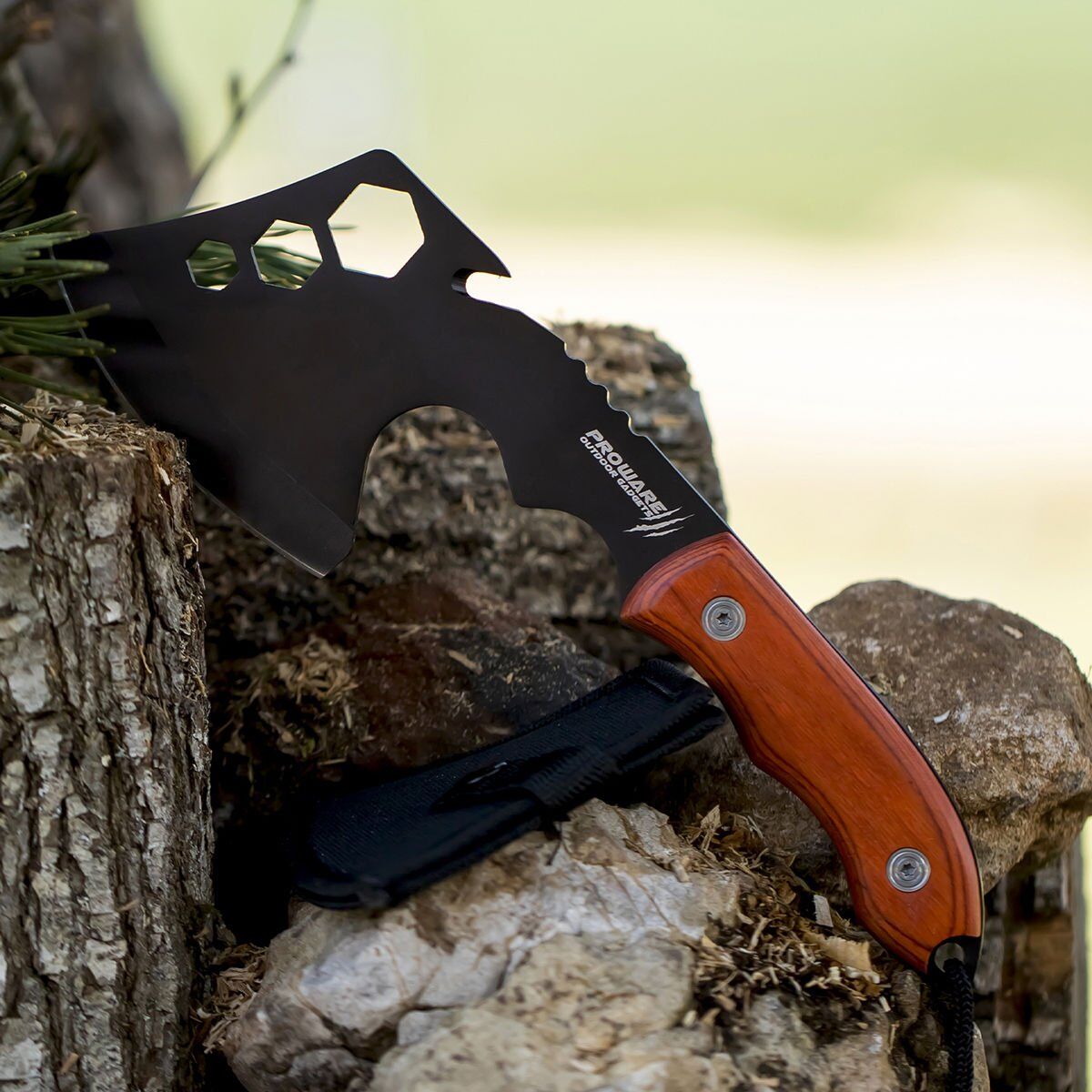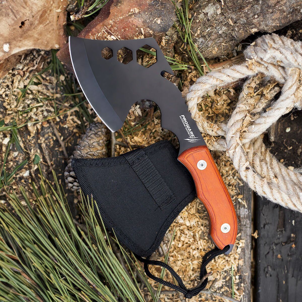 Ahşap sapı ve ergonomik yapısı sayesinde, konforlu bir kullanım sağlar. Ayrıca, üzerinde şişe açacağı mevcuttur. Bu sayede, kamp yaparken veya açık havada vakit geçirirken bira veya soda açmak için ekstra bir alet taşımanıza gerek kalmaz.