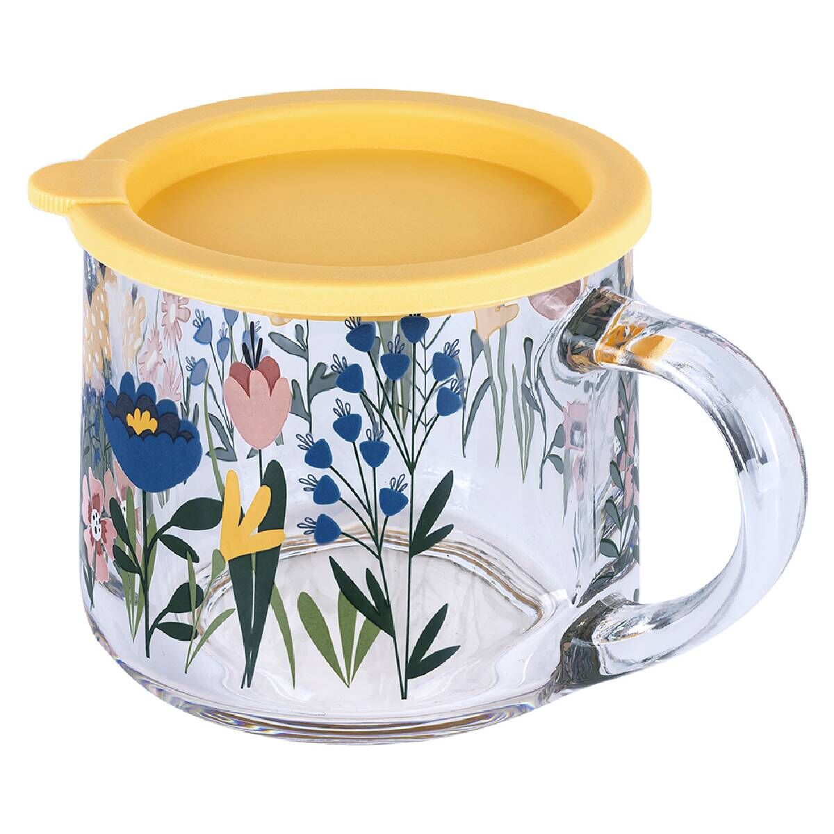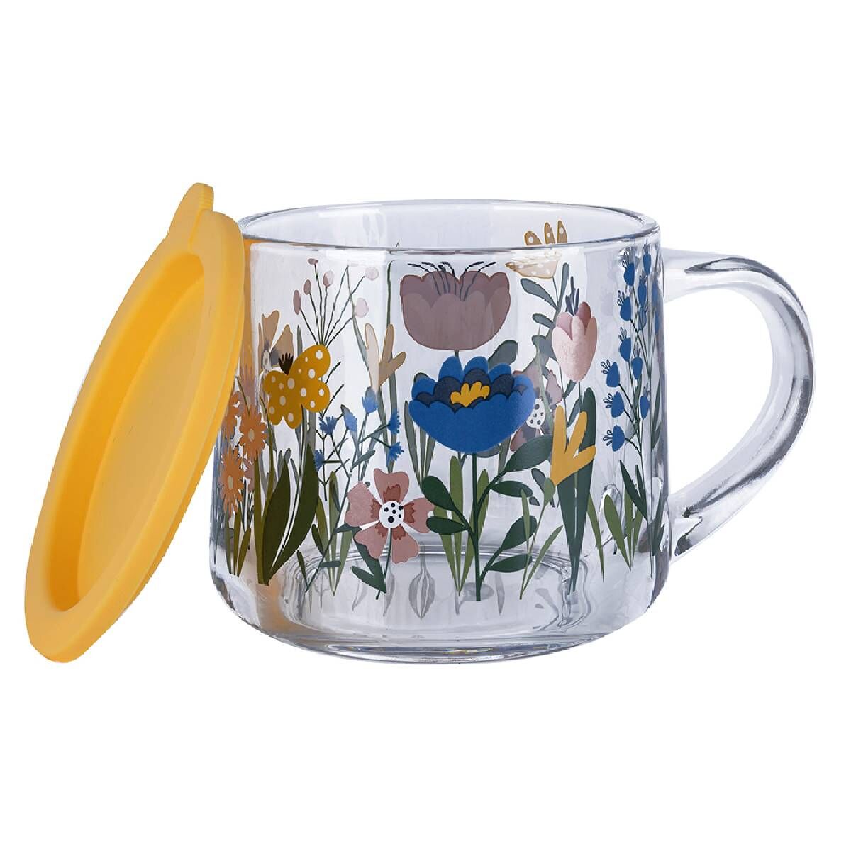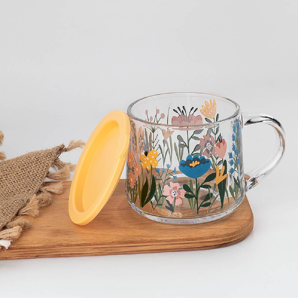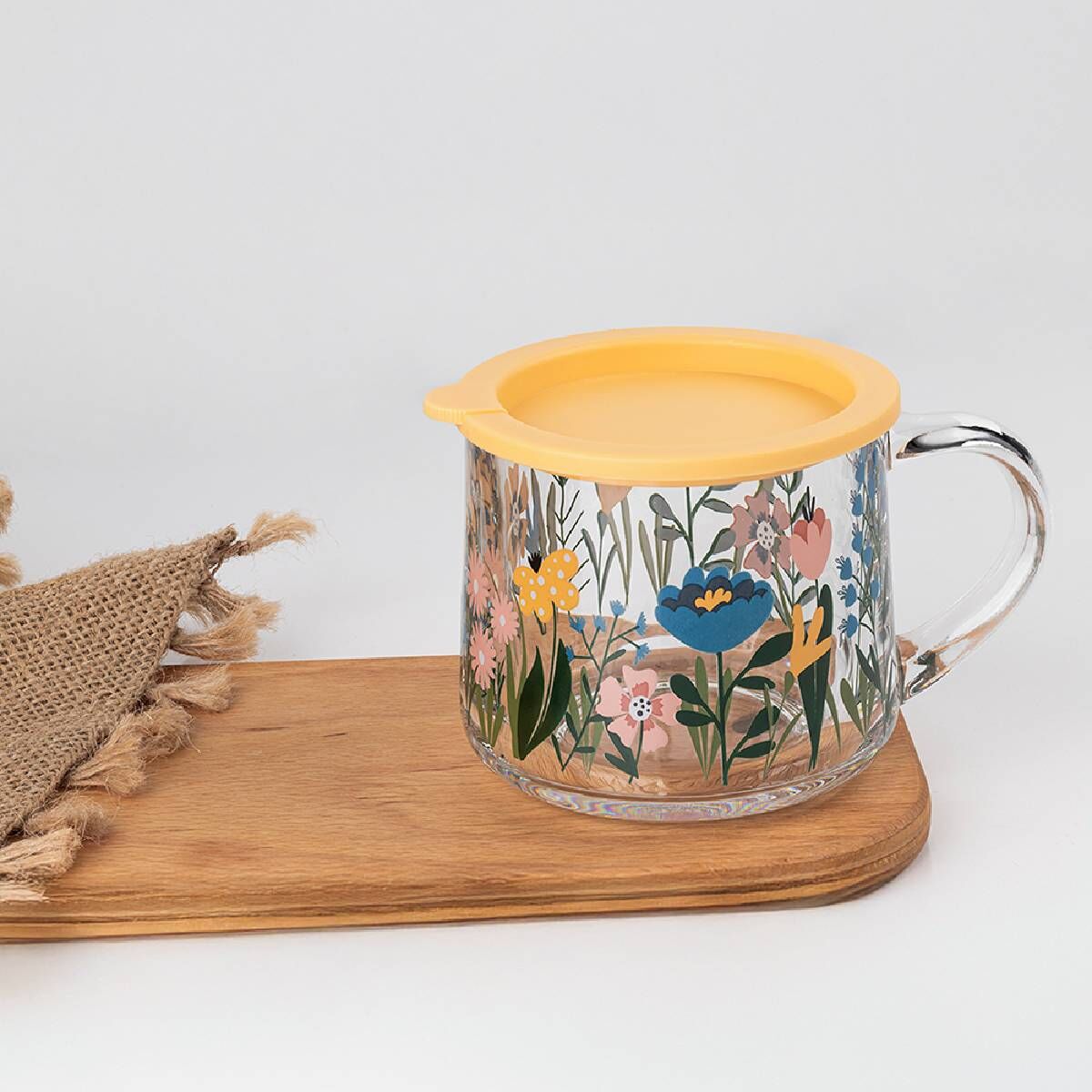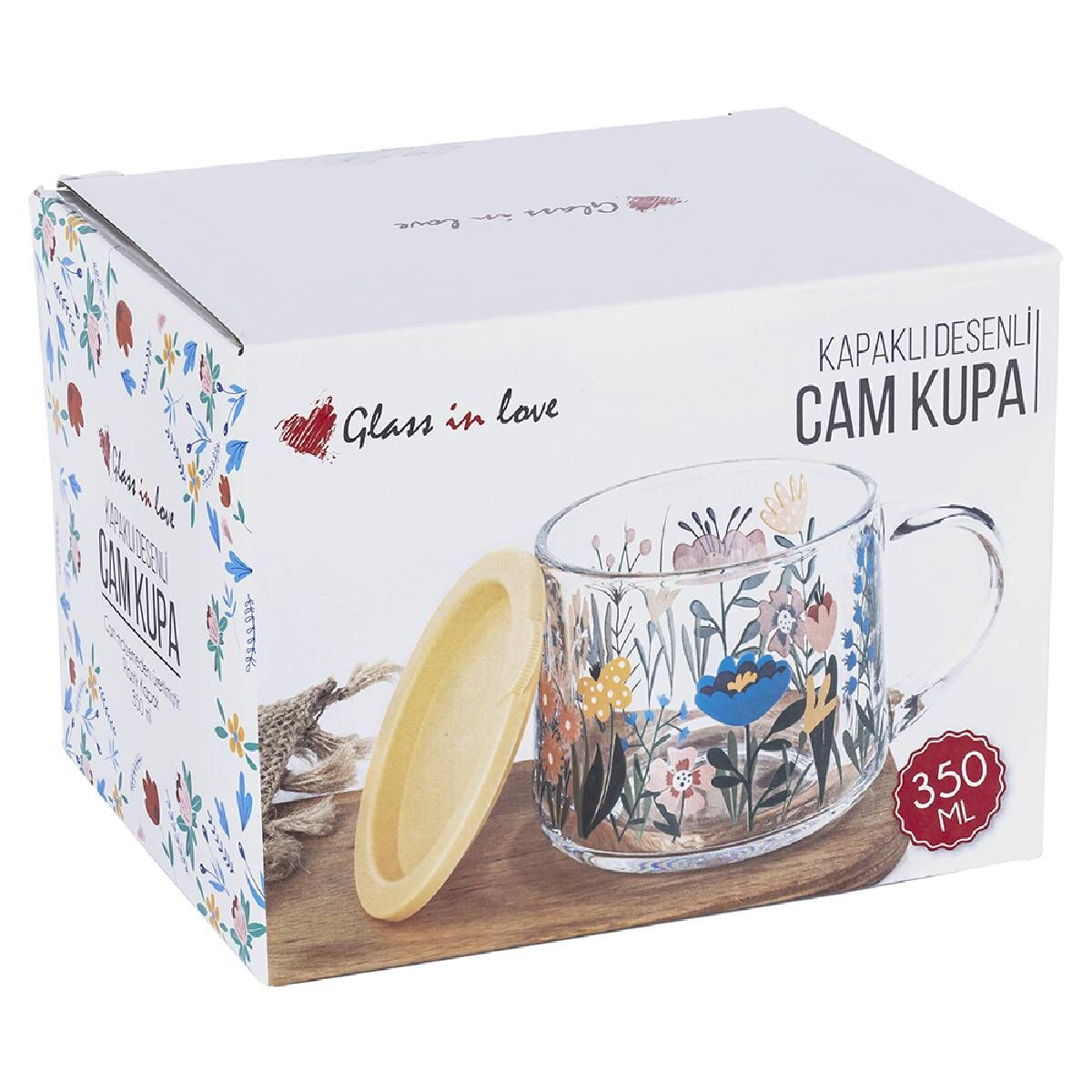 350 ml hacme sahip Kapaklı Desenli Cam Kupa, çay, kahve veya bitki çaylarınızı estetik ve konforlu şekilde sunmanıza olanak tanır.