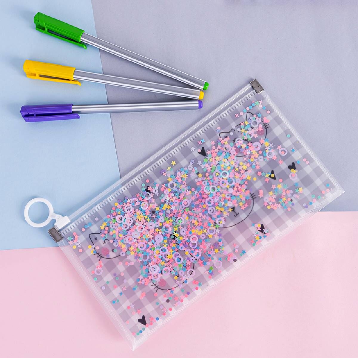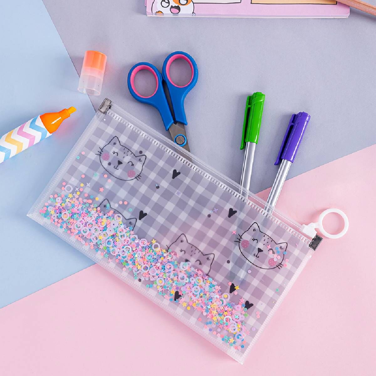 Sevimli kedi deseni ve ışıltılı sim detaylarıyla dikkat çeken Kedi Desenli Simli Şeffaf Kalemlik, hem işlevsel hem de eğlenceli bir kullanım sunar.