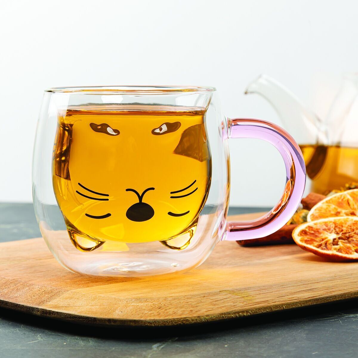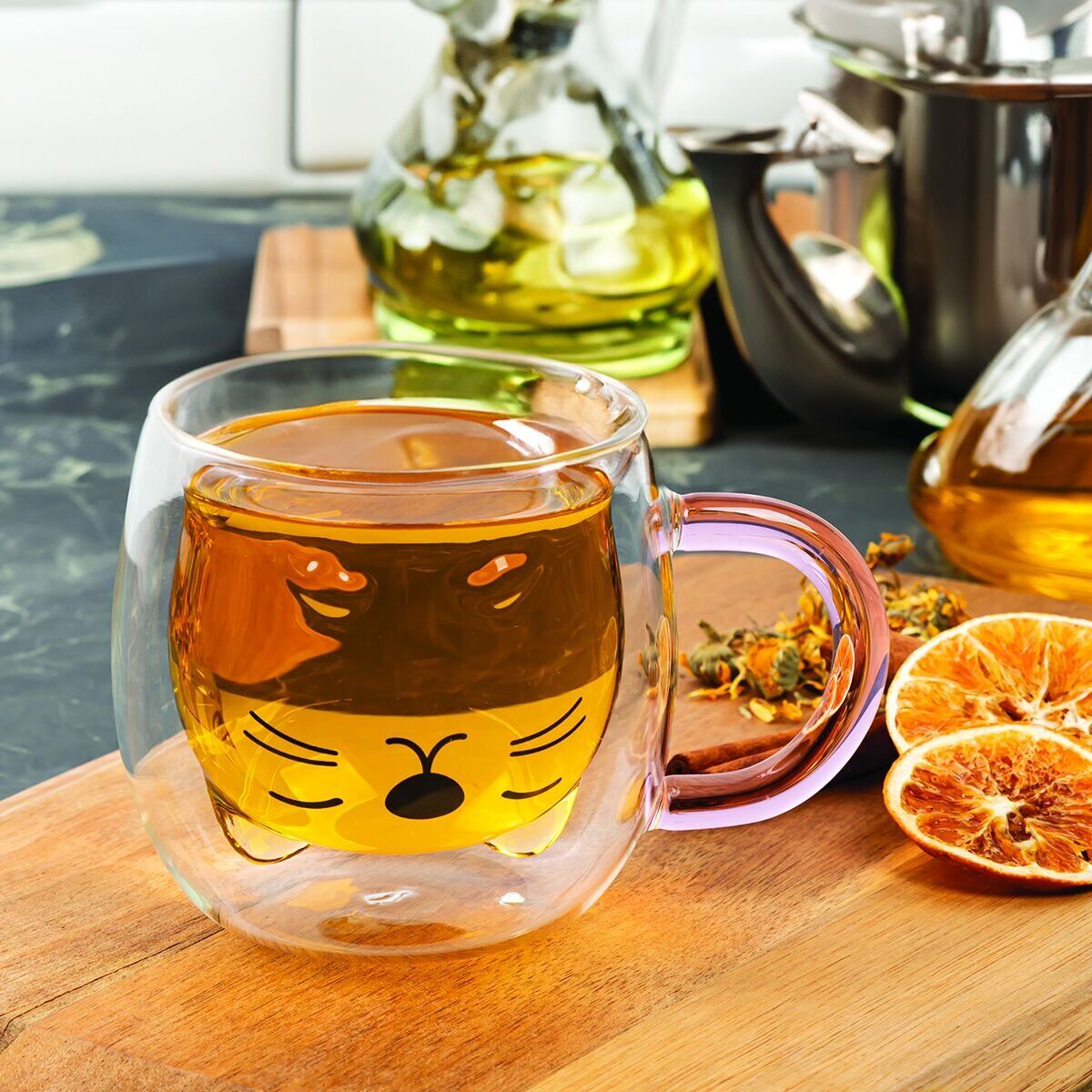 Kedili Çift Cidarlı Borosilikat Kupa, hem soğuk hem de sıcak içecekler için uygundur. Soğuk içeceklerinizin buz gibi kalmasına veya sıcak içeceklerinizin uzun süre sıcak kalmasına yardımcı olur.