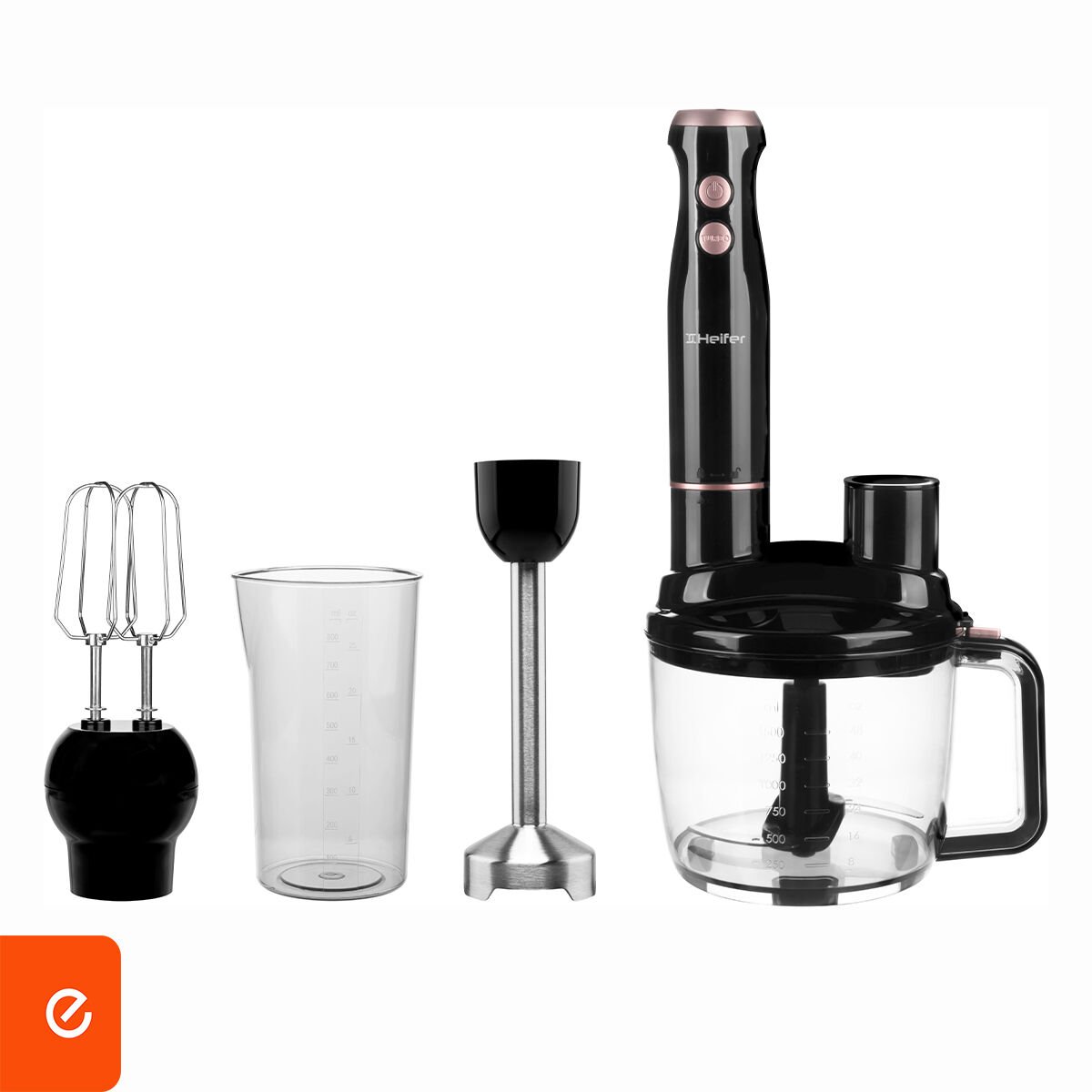 - 1500 ml. rende fonksiyonlu doğrayıcı hazne (rende bıçak setiyle) ve paslanmaz çelik başlıklı çırpıcı mikser aksesuarı ile farklı malzemeleri hazırlamak için ihtiyacınız olan her şeye sahip olursunuz.