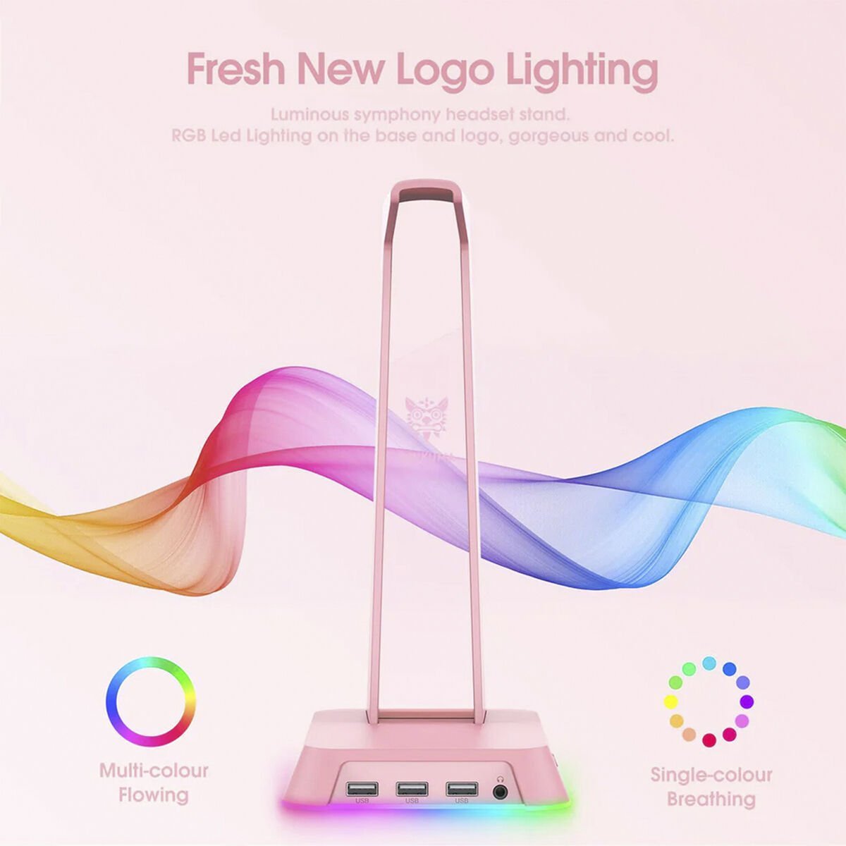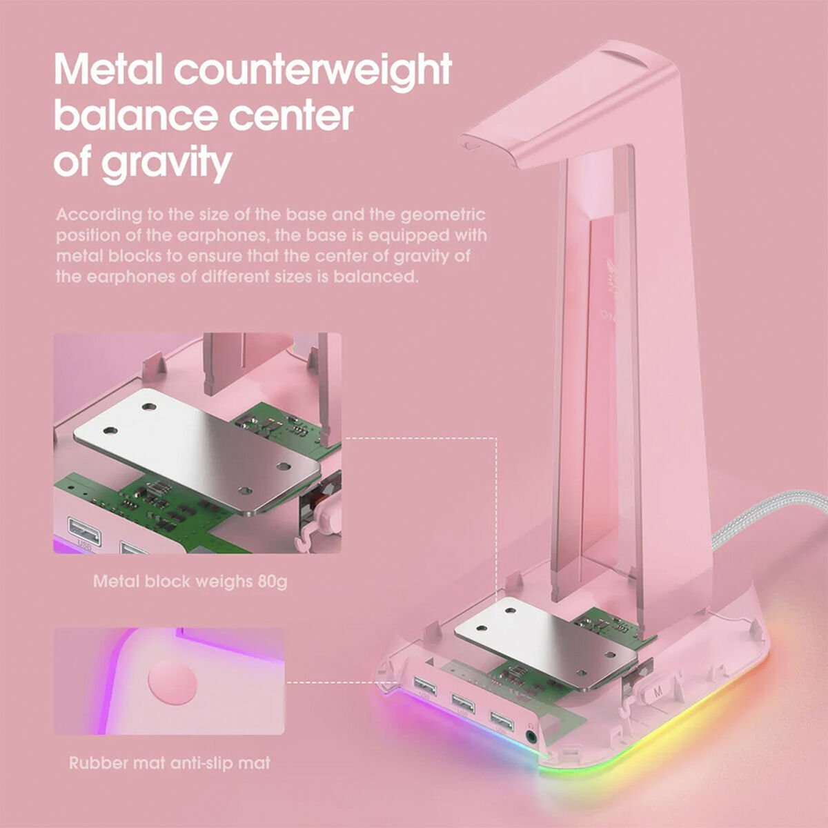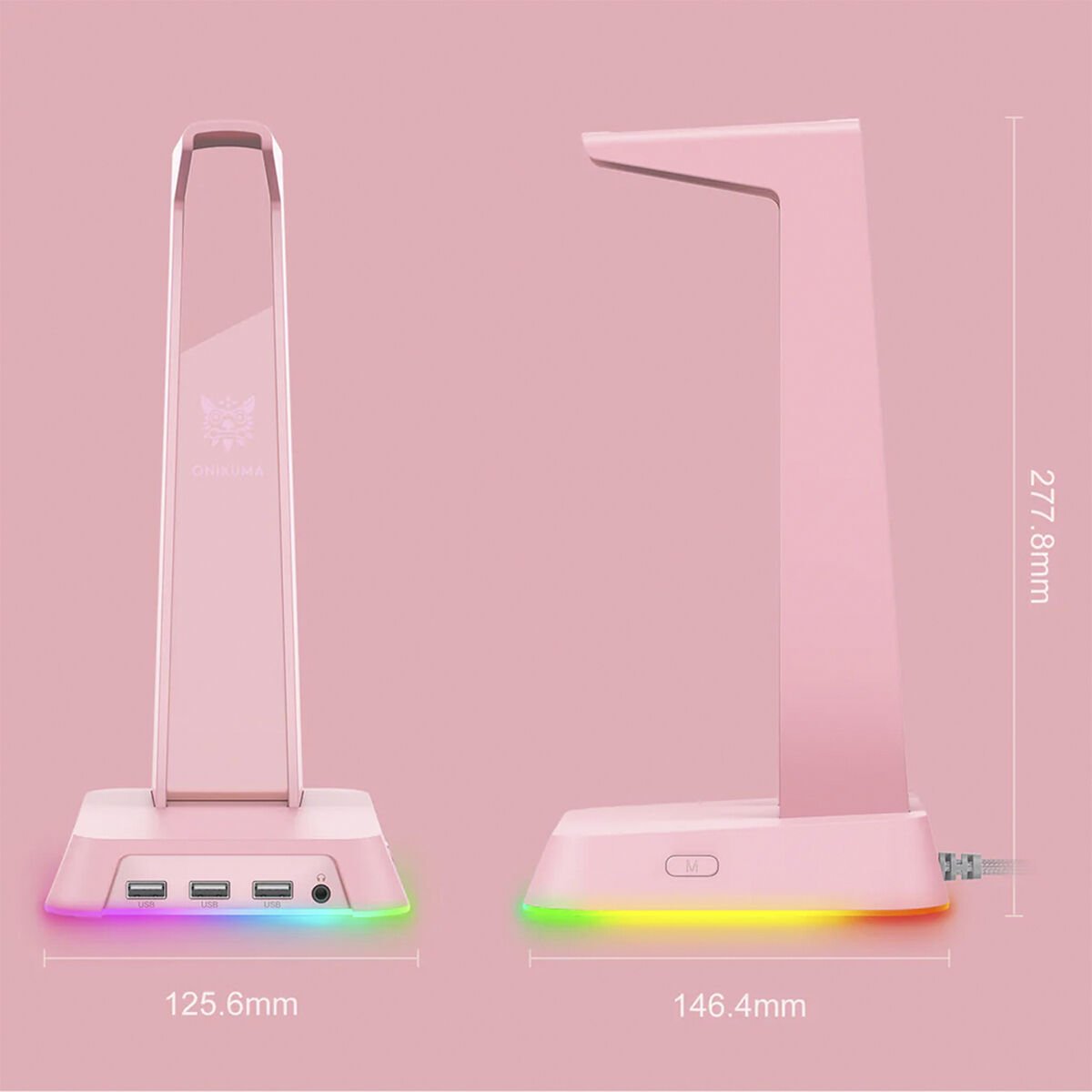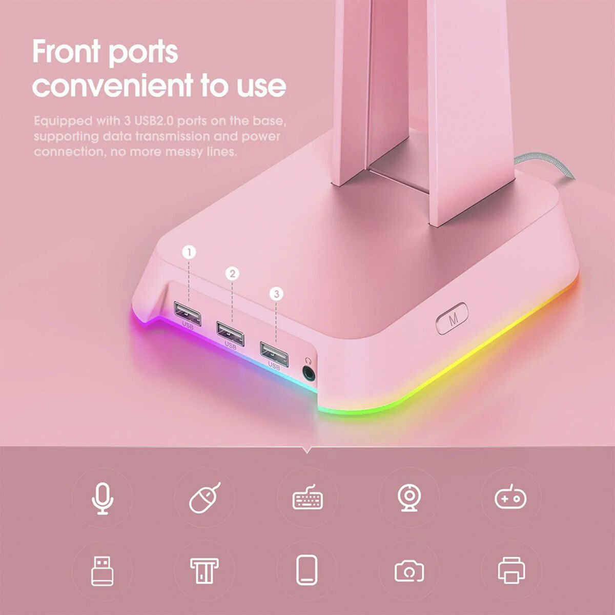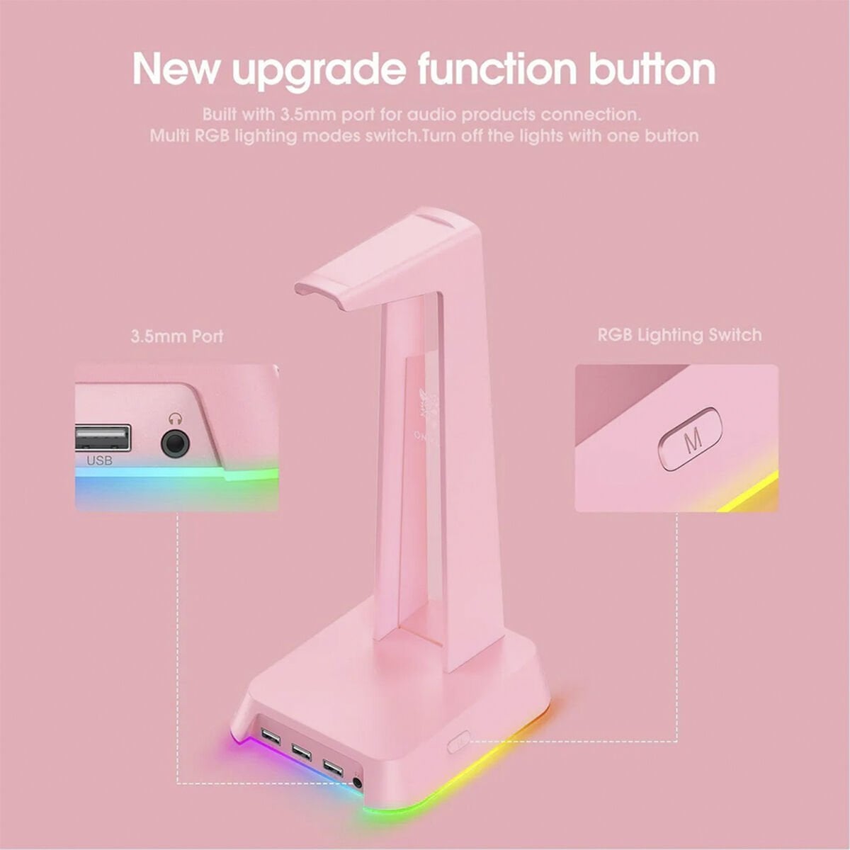 Oyuncu Kulaklığı Standı - Pembe, USB 2.0 portu, 3.5mm ses çıkışı ve RCB ışık efektleriyle masaüstünüzü düzenler, şıklık ve işlevsellik sunarak oyuncular için ideal çözümdür.