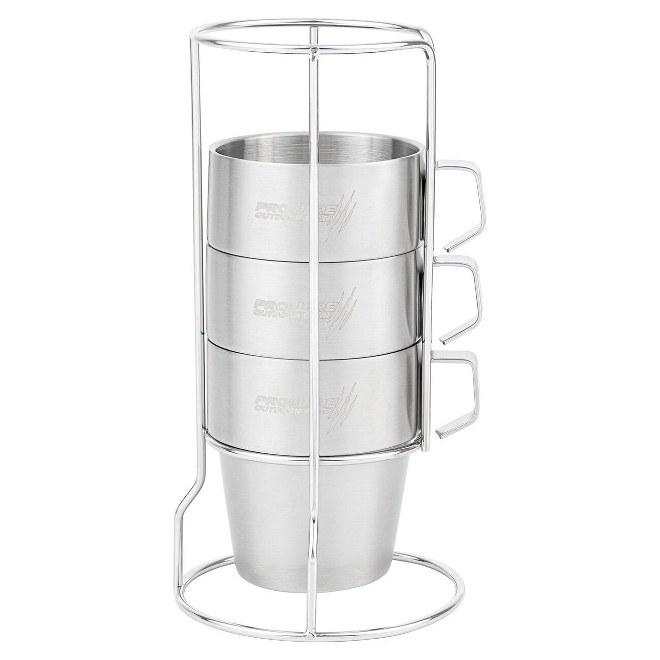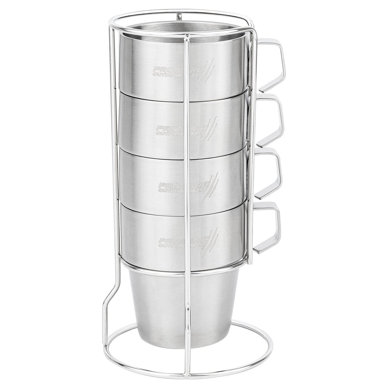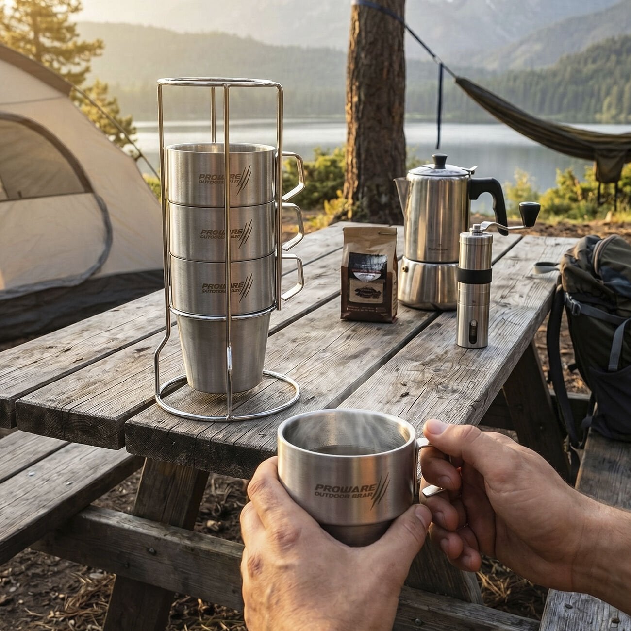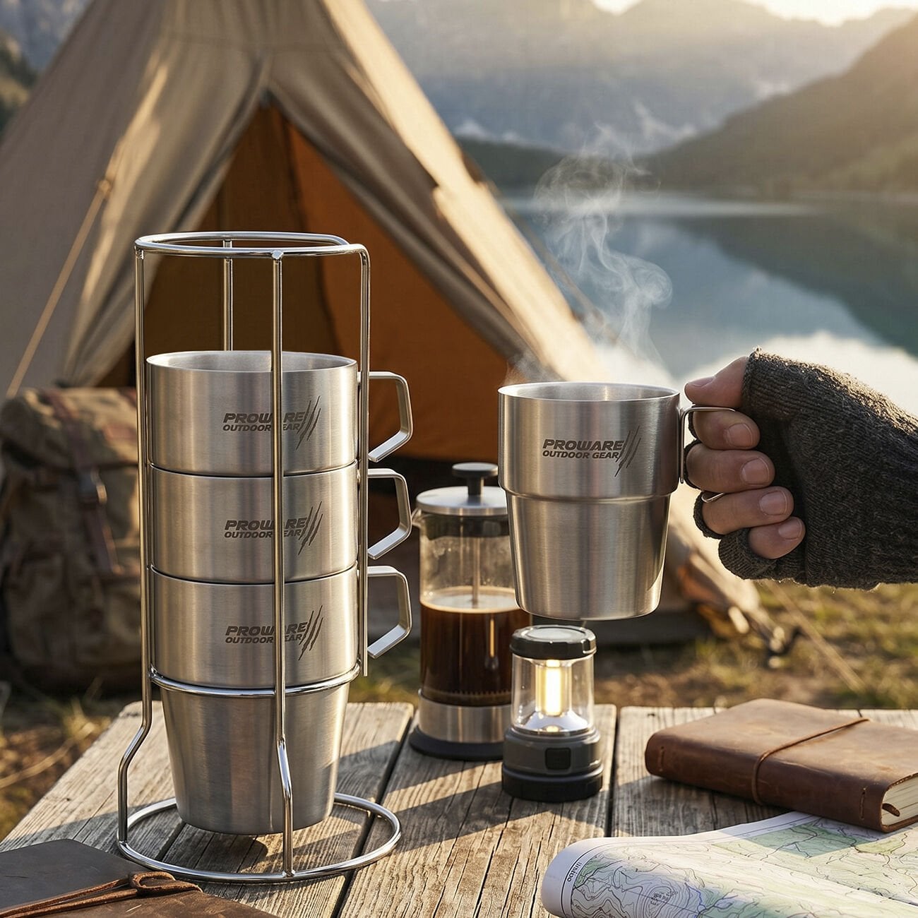 - Proware Paslanmaz Çelik 4’lü Kupa Seti, dayanıklı yapısı ve stantlı tasarımı sayesinde kamp, piknik, karavan, mutfak ve ofis kullanımları için pratik bir çözüm sunar.
