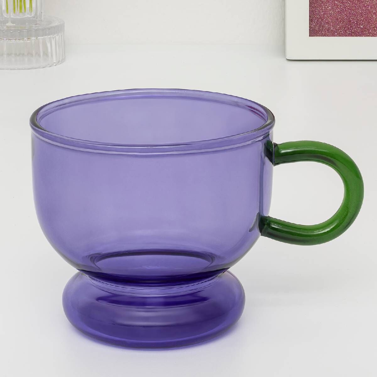 Sade ama göz alıcı tasarımıyla öne çıkan bu renkli kulplu cam kupa, hem işlevsel hem de dekoratif bir içecek deneyimi sunar. Sabah kahvesinden akşam çayına kadar tüm içeceklerinizde şıklığı ve konforu bir araya getirir.