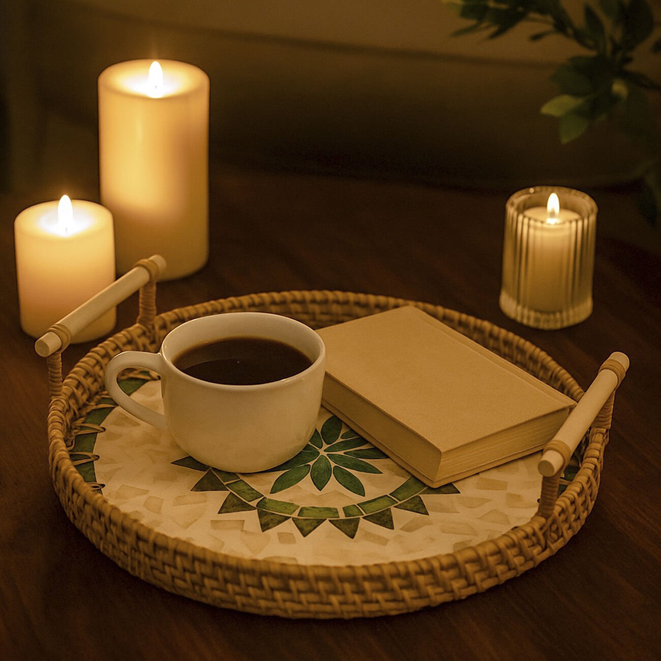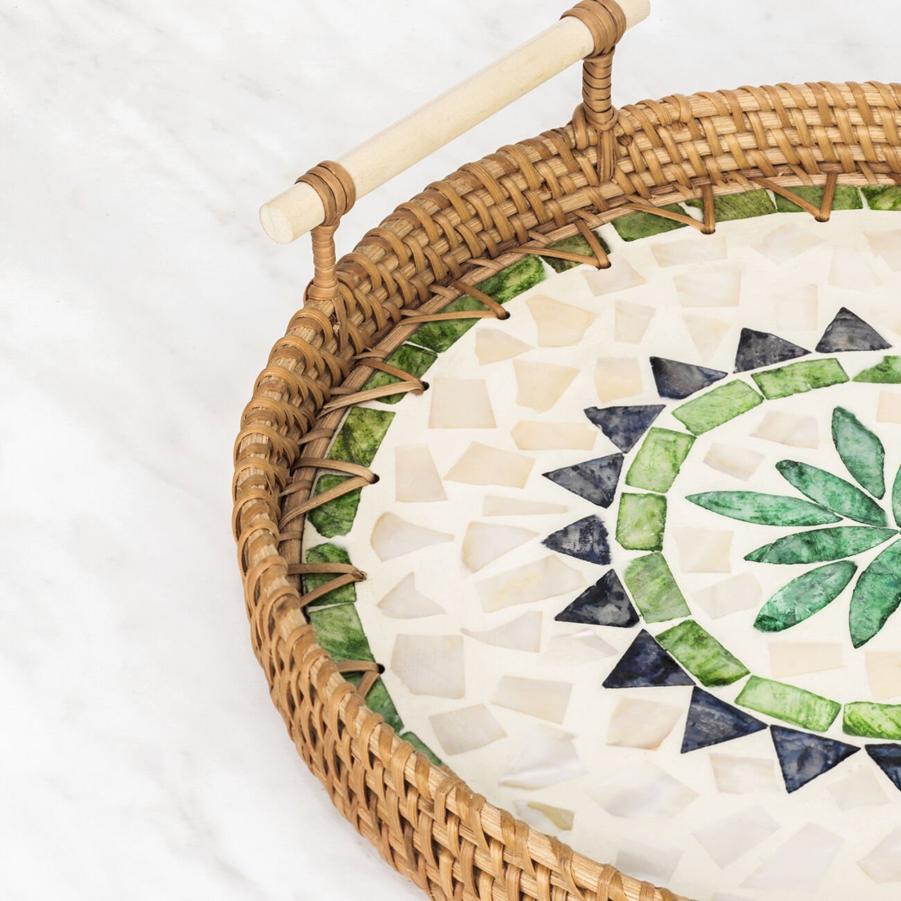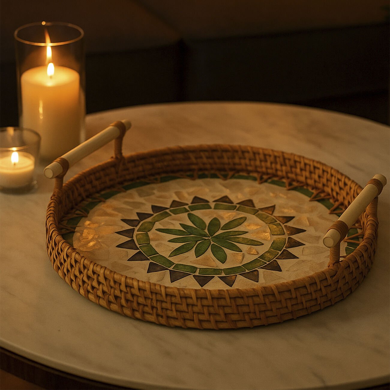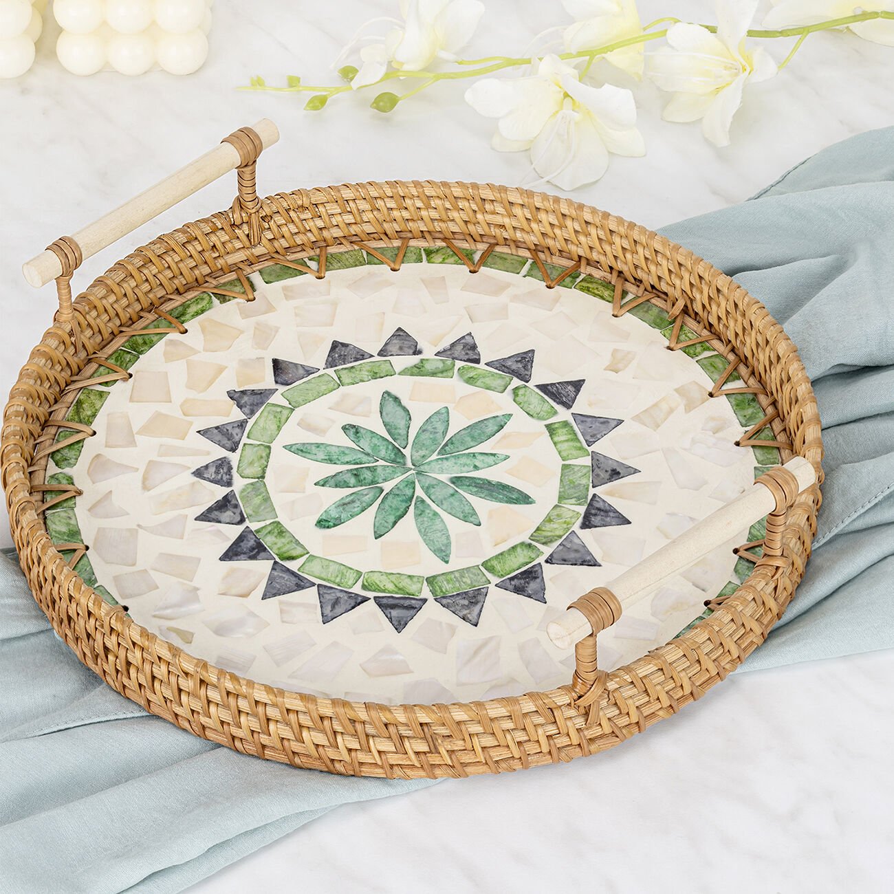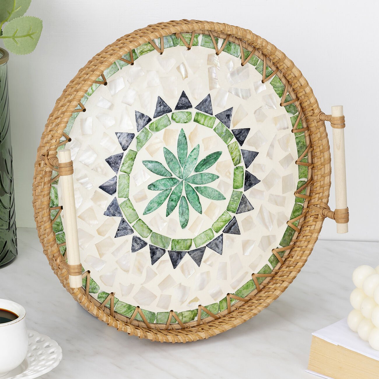 - Rattan malzemesi ve sedef işlemeleriyle bu tepsi, özel davetlerinizde veya günlük kullanımlarda sofralarınıza zarafet katar.