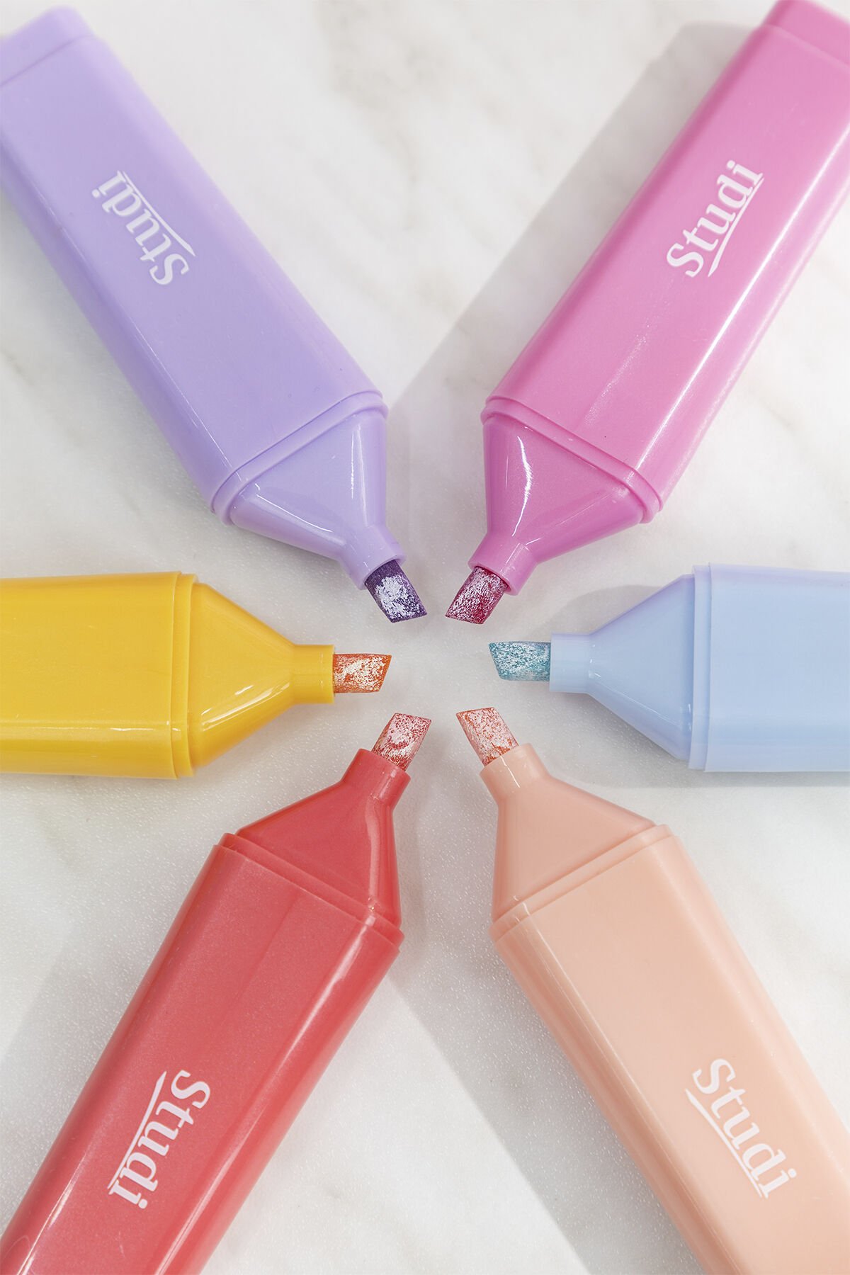 Okul ve ofis kullanımı için ideal olan Studi Simli Fosforlu Kalem Seti, 6 farklı renk seçeneği ile notlarınızı ve önemli bilgilerinizi öne çıkarmanıza yardımcı olur.