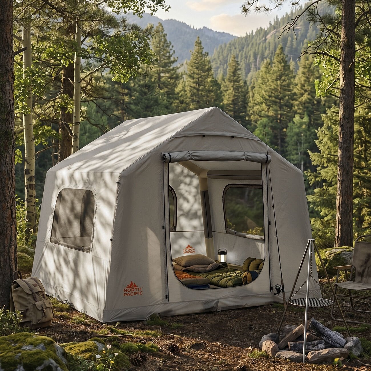 - North Pacific Şişme Kamp Çadırı, hızlı kurulum sağlayan hava direkli yapısı ve geniş iç hacmi ile kamp, doğa tatili ve uzun süreli konaklamalar için konforlu bir çözüm sunar.
