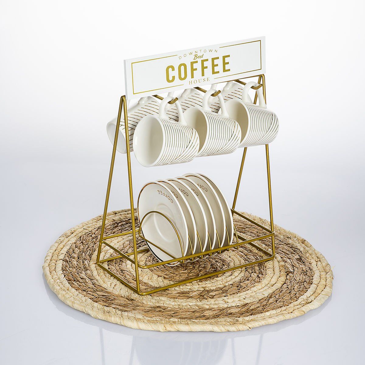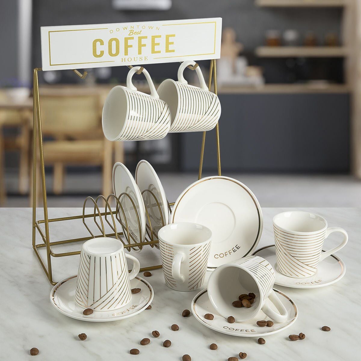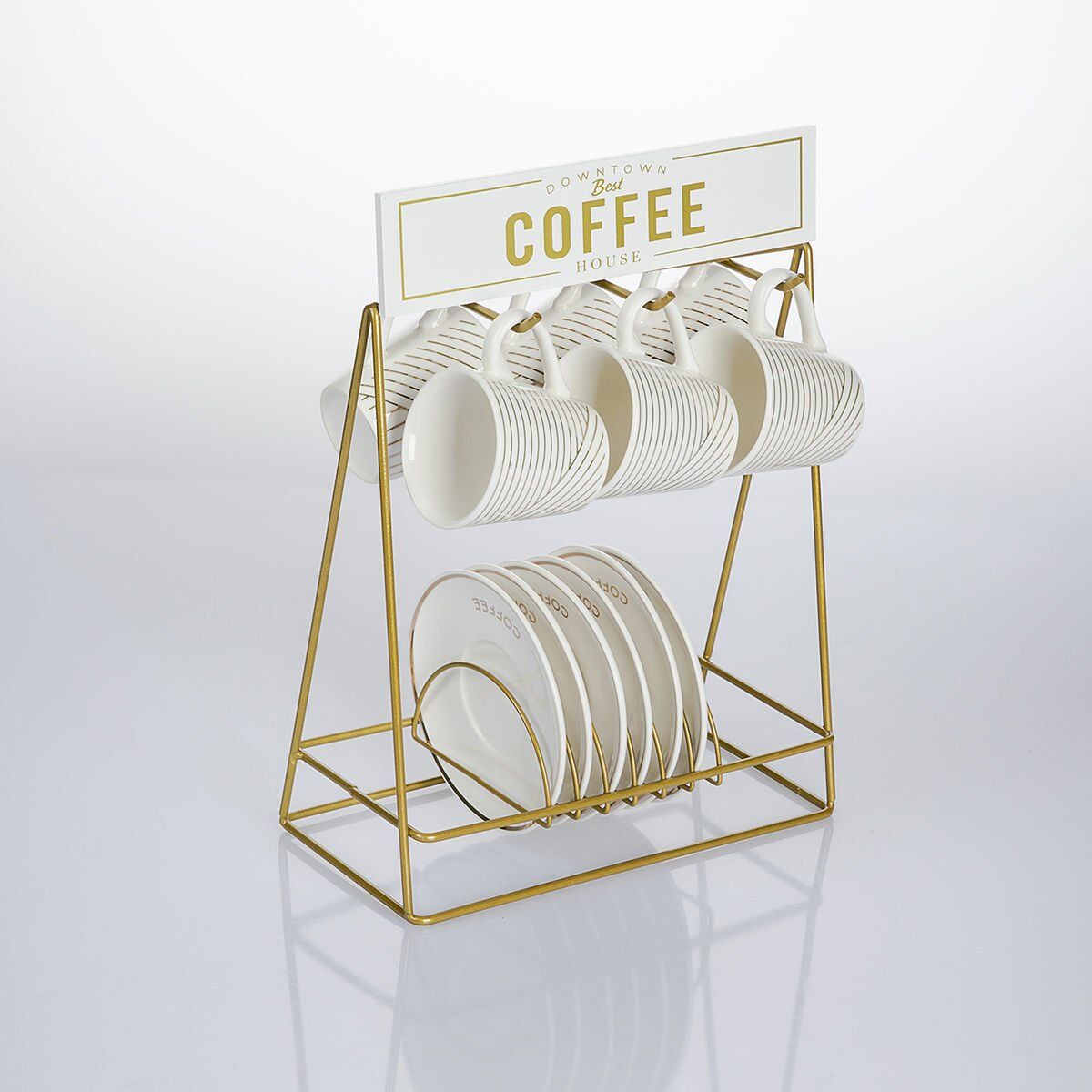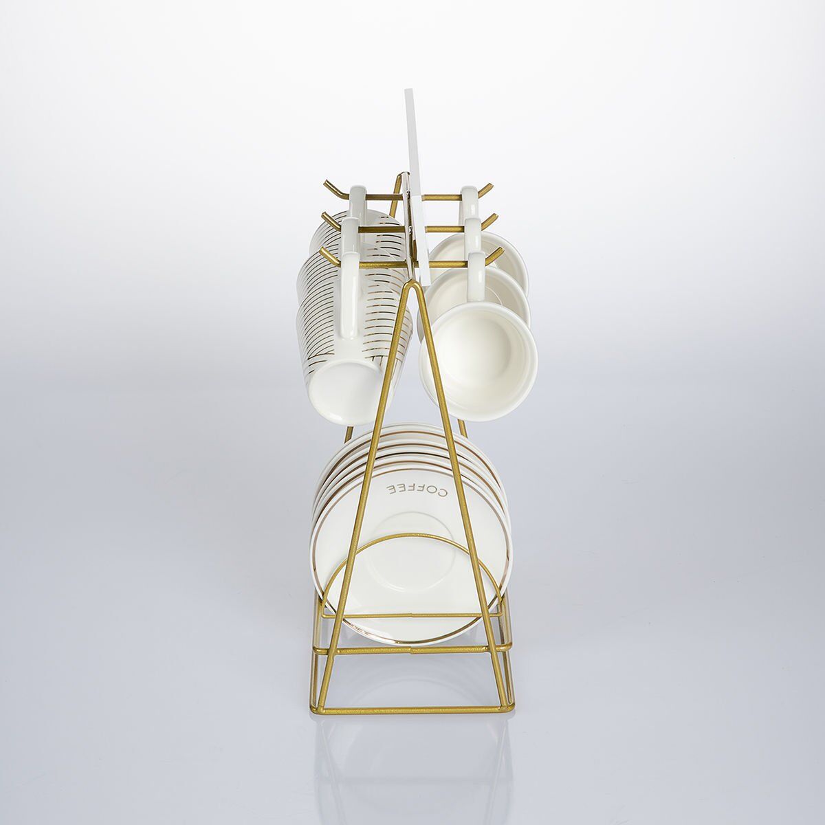 Bu standlı porselen kahve fincanı seti, şık ve zarif tasarımıyla kahve keyfinize eşlik eder. 6 adet 90 ml fincan ve 6 adet fincan tabağı ile birlikte gelir. Gold renk metal standı sayesinde, fincanlarınızı şık bir şekilde sergileyebilirsiniz.